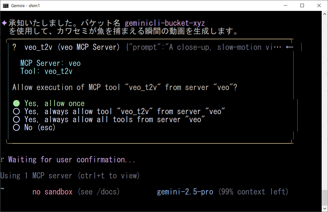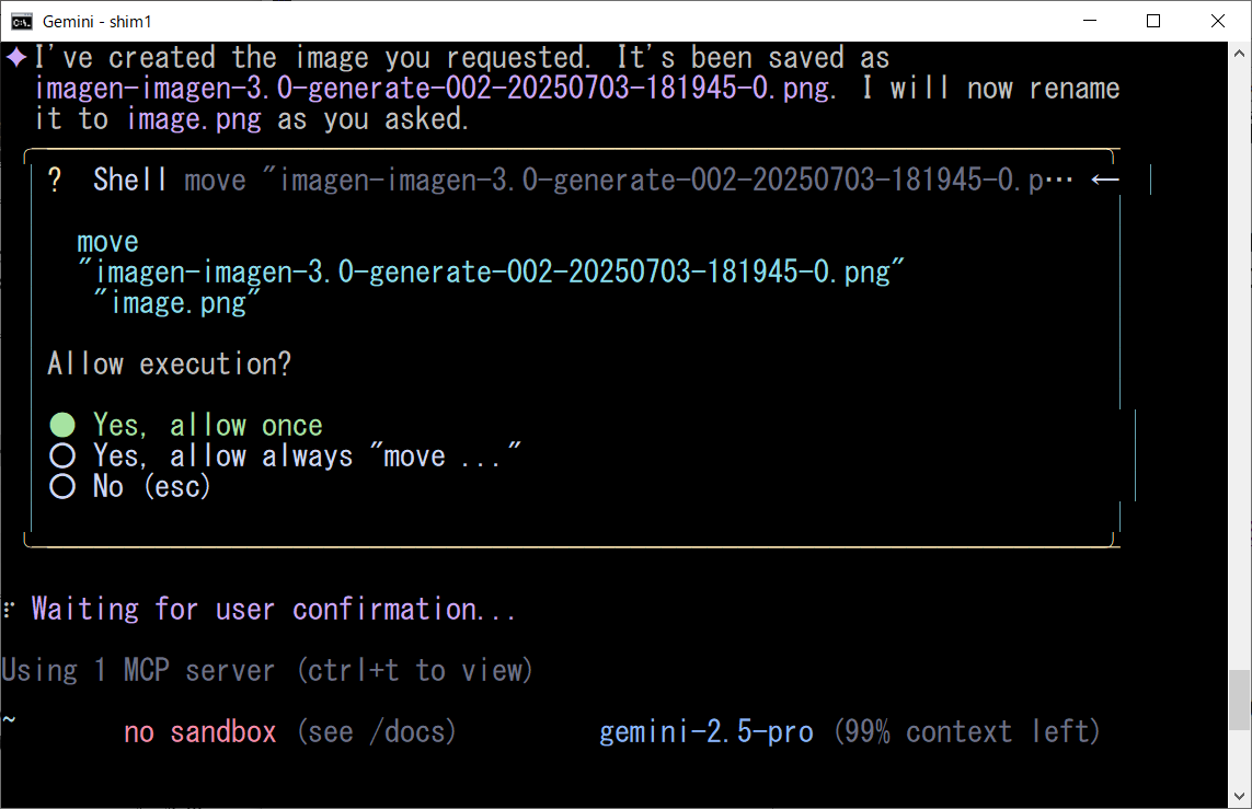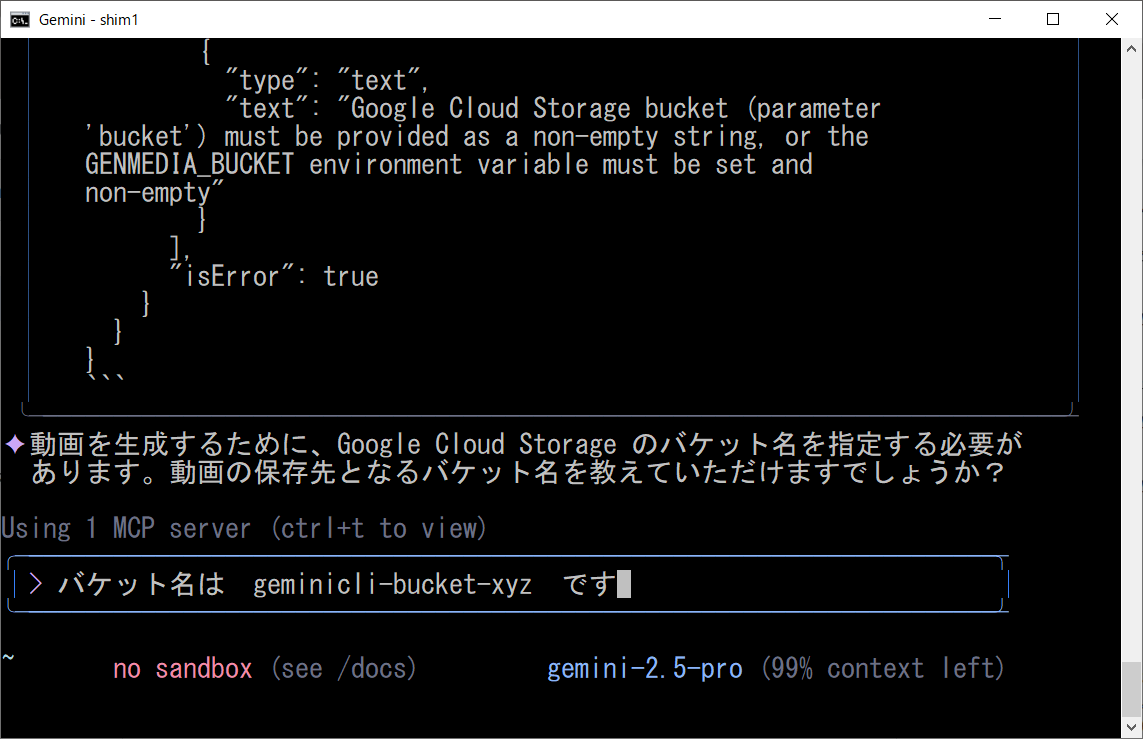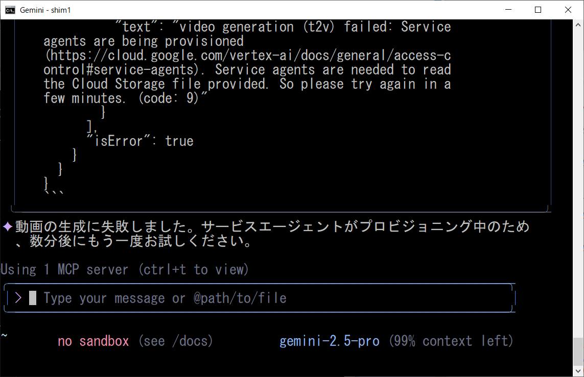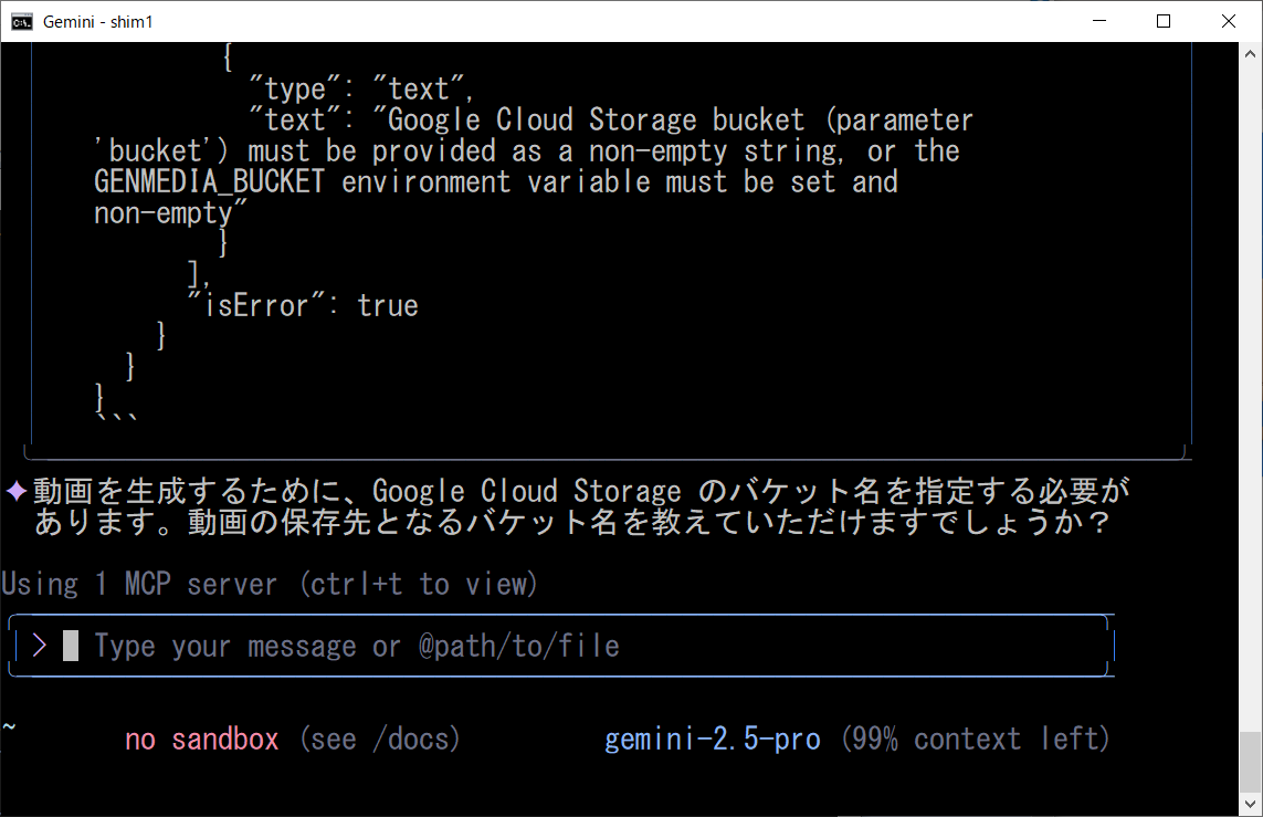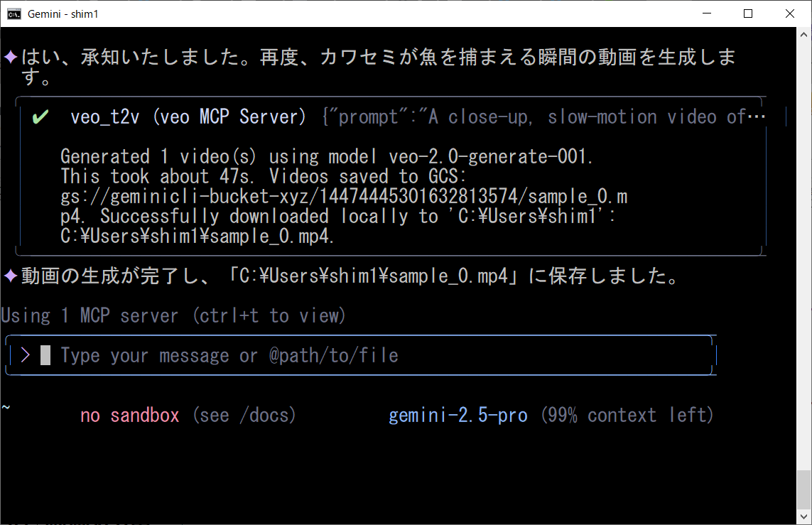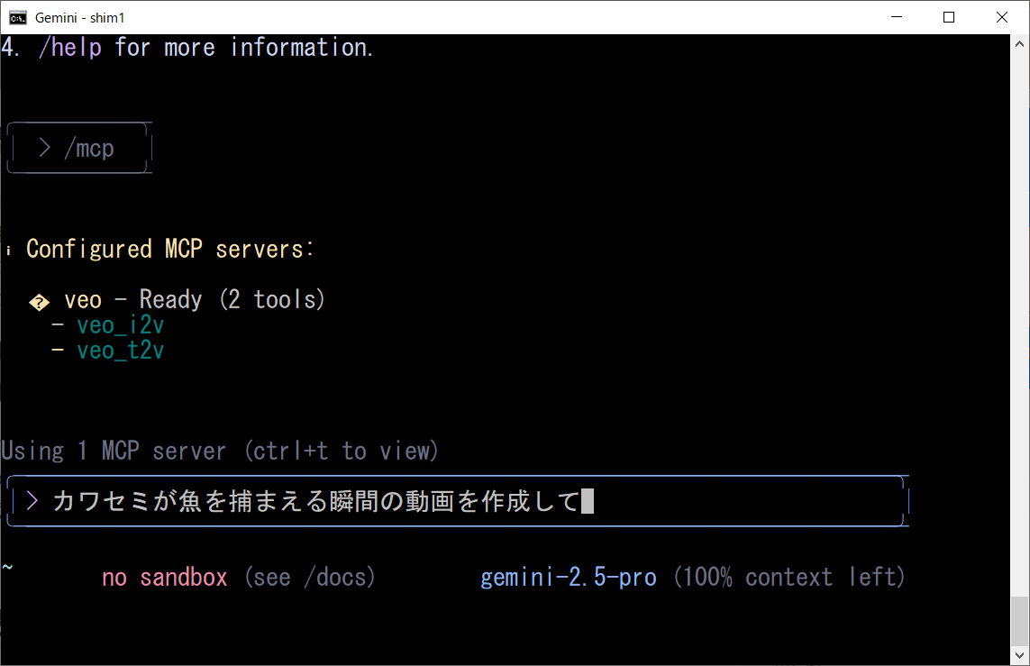 { "mcpServers": { "imagen": { "command": "mcp-imagen-go", "env": { "MCP_SERVER_REQUEST_TIMEOUT": "300", "PROJECT_ID": "{PROJECT_ID}" } }, "veo": { "command": "mcp-veo-go", "env": { "MCP_SERVER_REQUEST_TIMEOUT": "300", "PROJECT_ID": "{PROJECT_ID}" } } }, "theme": "Default", "selectedAuthType": "oauth-personal" }○静止画の作成