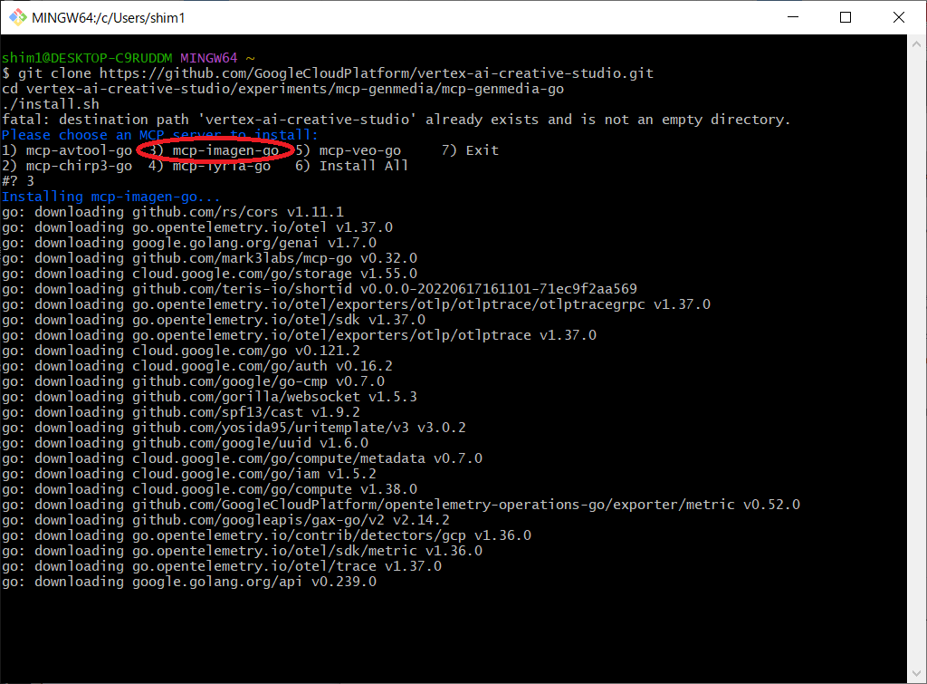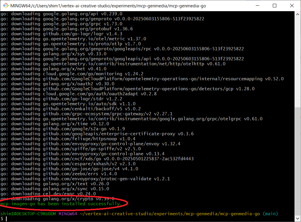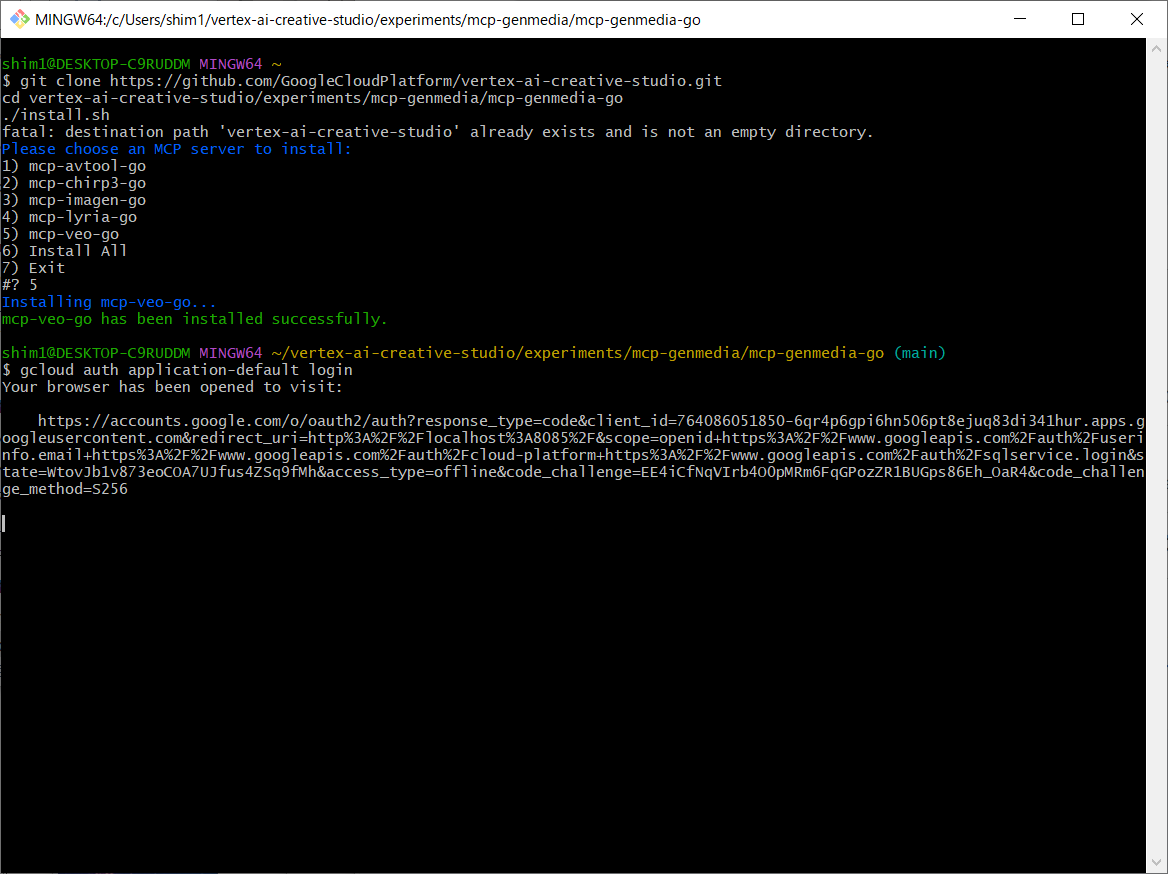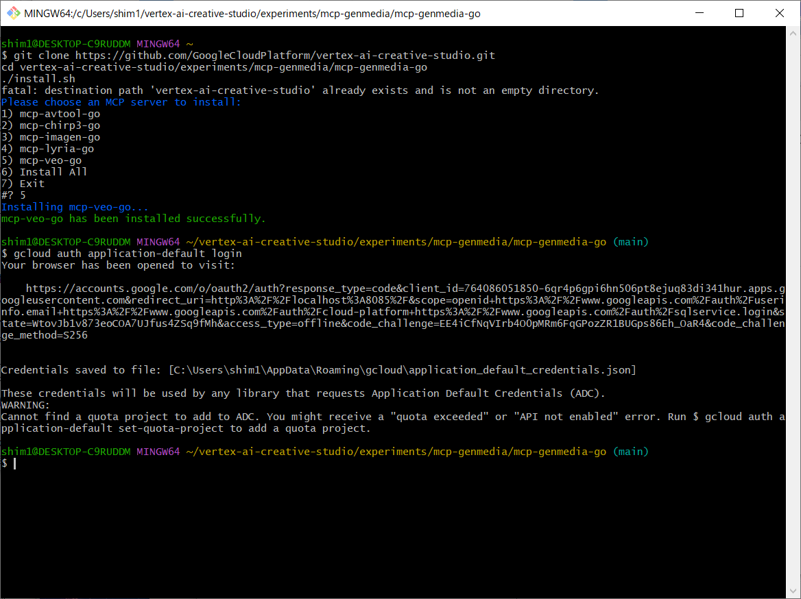 git clone https://github.com/GoogleCloudPlatform/vertex-ai-creative-studio.git cd vertex-ai-creative-studio/experiments/mcp-genmedia/mcp-genmedia-go ./install.sh