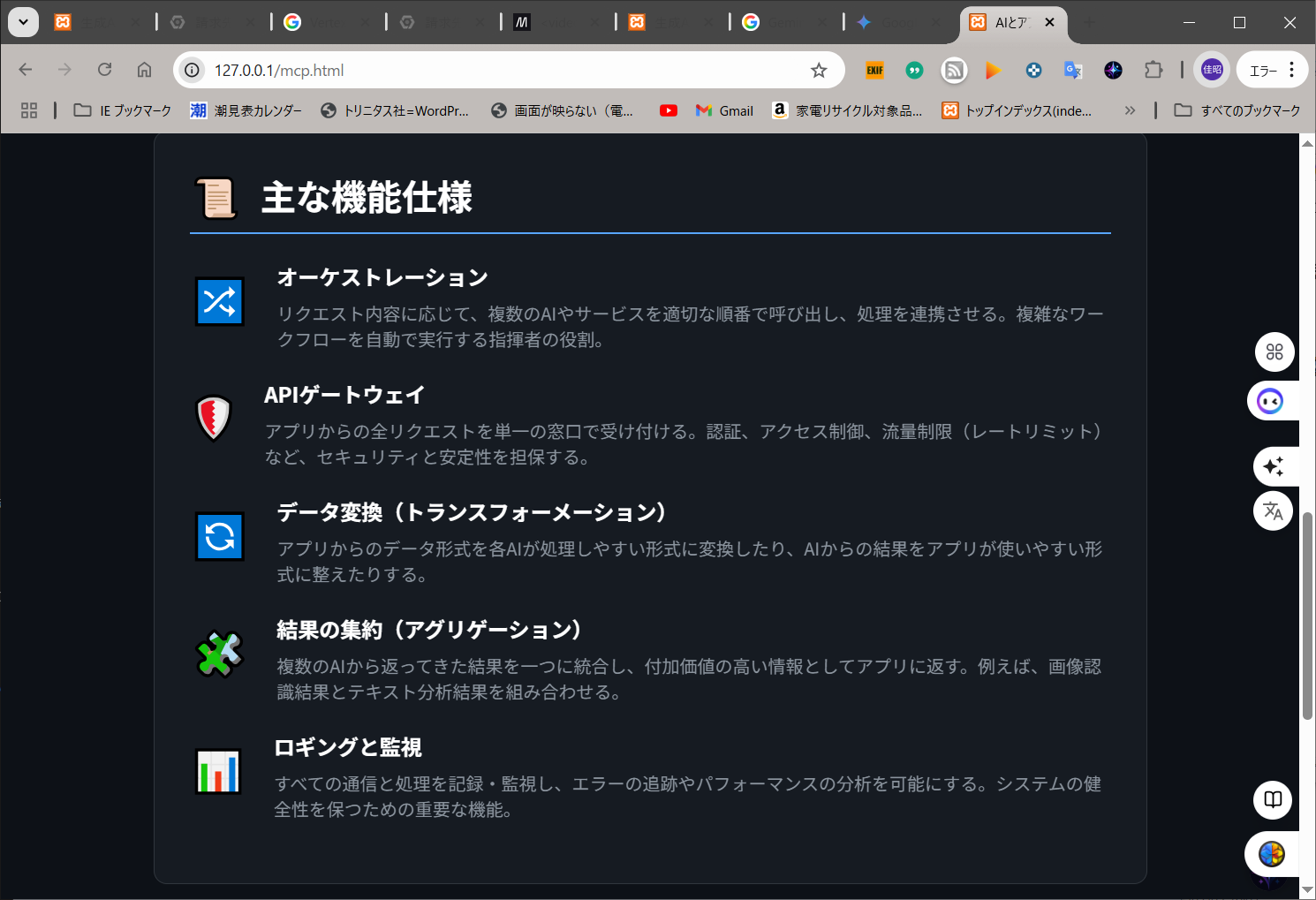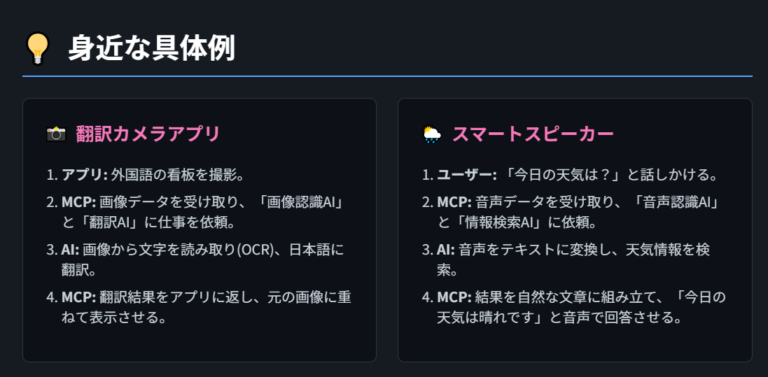 Model Context Protocol(MCP)とは?生成 AI の可能性を広げる新しい標準 https://zenn.dev/cloud_ace/articles/model-context-protocol OpenAIとGoogleが、AIエージェントの共通プロトコル(通信規約)であるMCP(Model Context Protocol)を正式にサポートすると発表した。 MCPはAnthropicが開発した通信規約だが、競合関係にあるAI大手がサポートすることでMCPが業界標準プロトコルになることが事実上確定した。 異なる開発者が構築した複数のエージェントが連携・協力可能なマルチエージェントの時代が始まろうとしている。 Microsoftは2025年5月19日、開発者向け年次イベント「Microsoft Build 2025」にて、同社のAIプラットフォームやフレームワーク全体にModel Context Protocol(MCP)のサポートを提供していくことを発表した。 AWS は Amazon Elastic Container Service (Amazon ECS) アプリケーション構築のための Model Context Protocol (MCP) サーバーを発表しました。2025 年 5 月 29 日