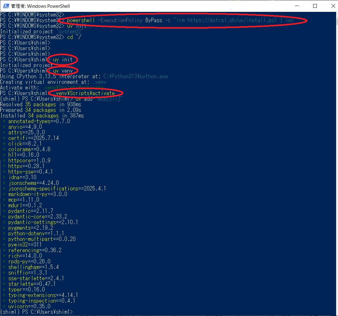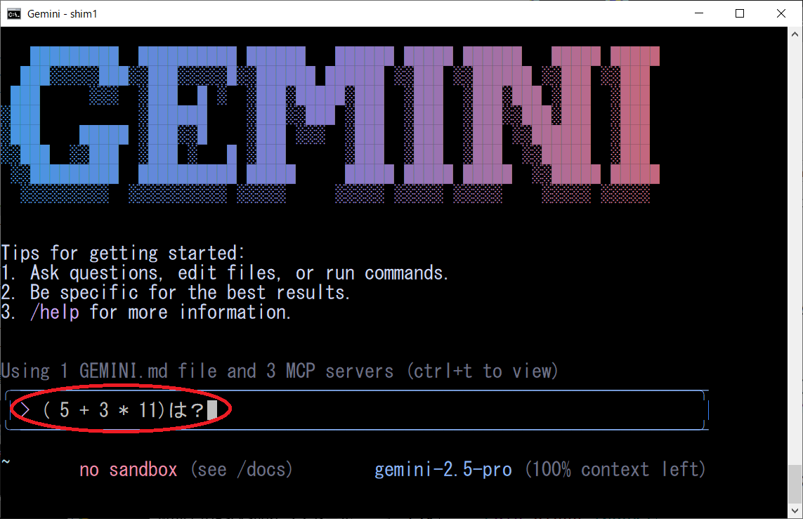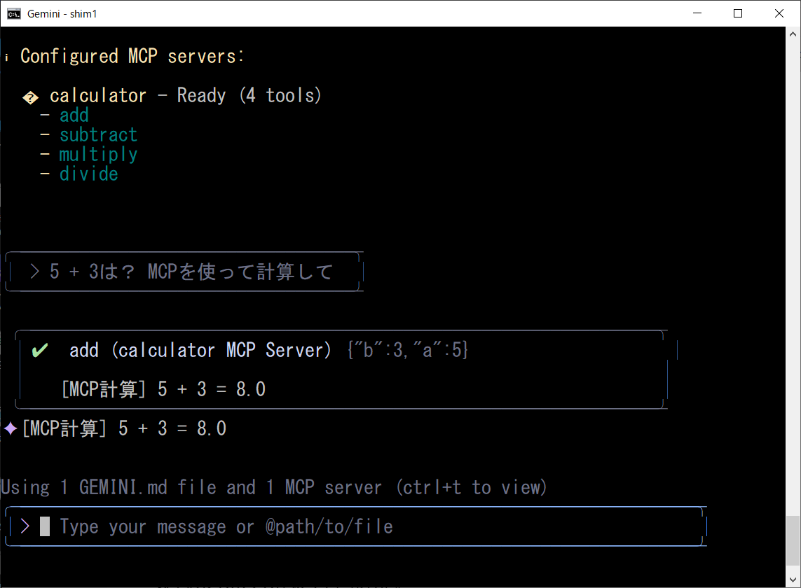 1. 環境構築:uvパッケージマネージャのインストール powershell -ExecutionPolicy ByPass -c "irm https://astral.sh/uv/install.ps1 | iex" 2. プロジェクト作成と仮想環境のセットアップ mkdir greet cd greet uv init . uv venv .venv\Scripts\activate 3. 必要なパッケージのインストール uv add "mcp[cli]" 4. 四則演算MCPサーバーの実装 calculator.py 5. 設定ファイル:settings.json ※下記「settings.jsoの設定内容」参照 6. 実行:gemini起動後、以下のプロンプトを入力 5 + 3は? MCPを使って計算して○settings.jsonの設定内容