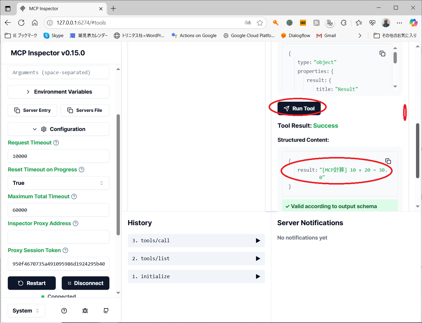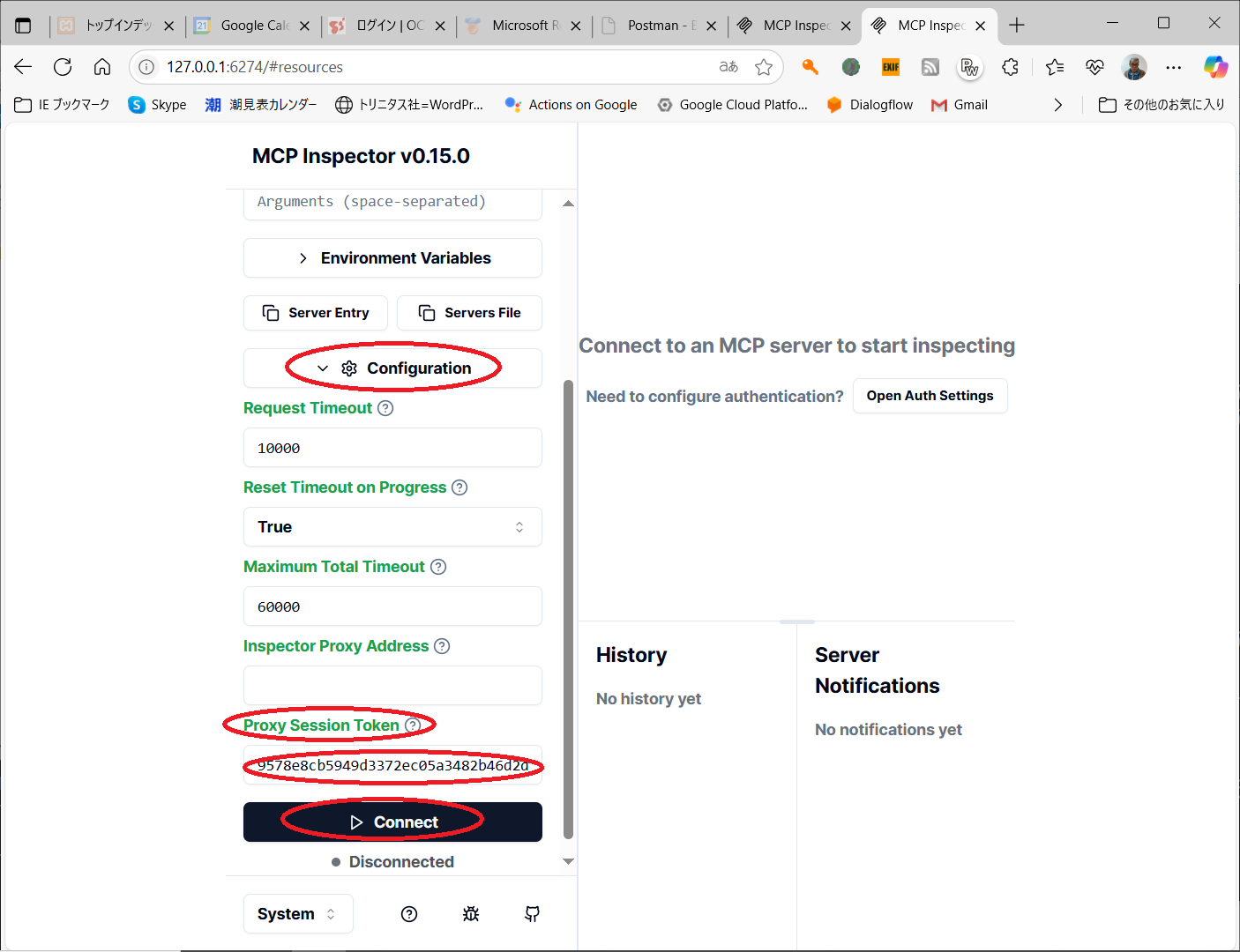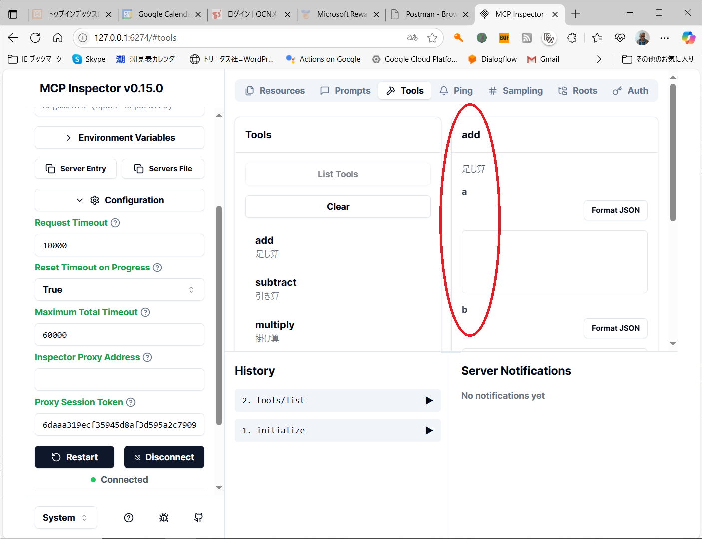 C:\Users\shim1>npx @modelcontextprotocol/inspector .\calculator.py Starting MCP inspector... ⚙️ Proxy server listening on 127.0.0.1:6277 🔑 Session token: 6daaa319ecf35945d8af3d595a2c7909864c551f708844153a6ef80bd71cacae Use this token to authenticate requests or set DANGEROUSLY_OMIT_AUTH=true to disable auth 🔗 Open inspector with token pre-filled: http://localhost:6274/?MCP_PROXY_AUTH_TOKEN=6daaa319ecf35945d8af3d595a2c7909864c551f708844153a6ef80bd71cacae 🔍 MCP Inspector is up and running at http://127.0.0.1:6274 🚀※ブラウザで「 http://127.0.0.1:6274」アクセスして、Proxy Auth Tokenを設定します。