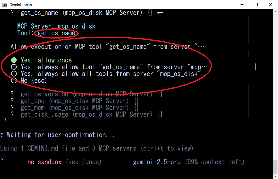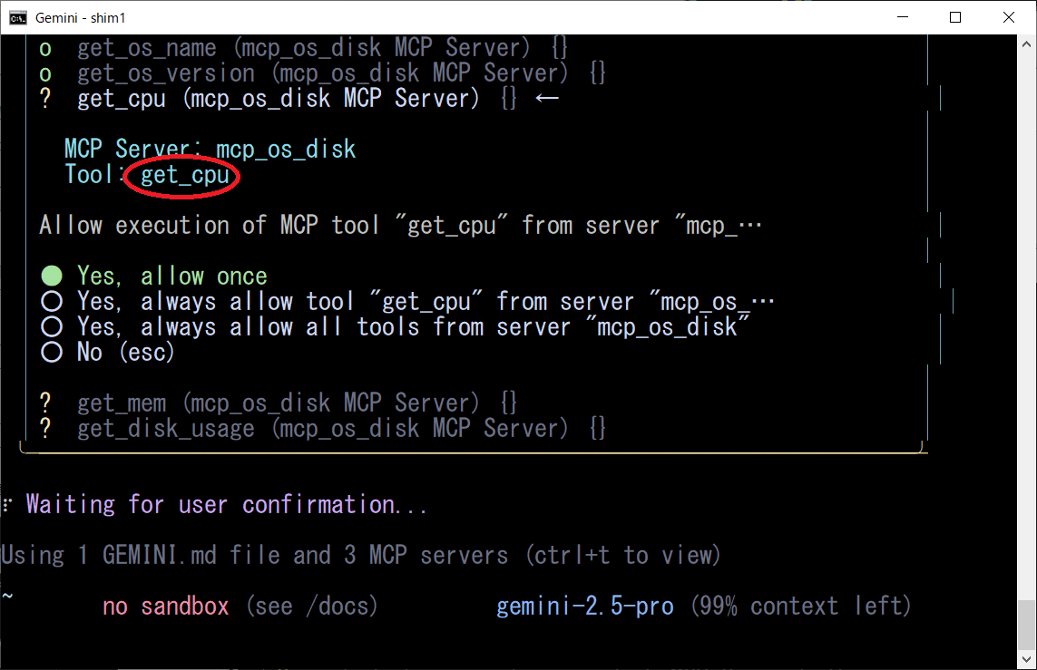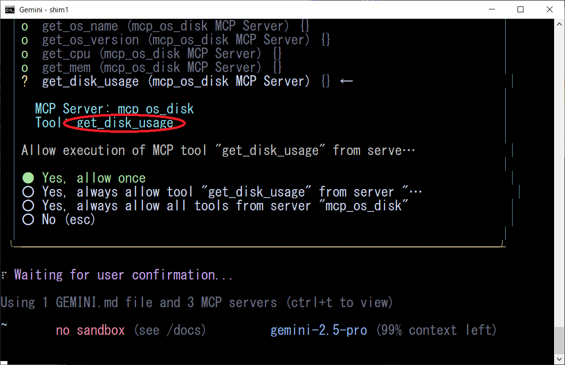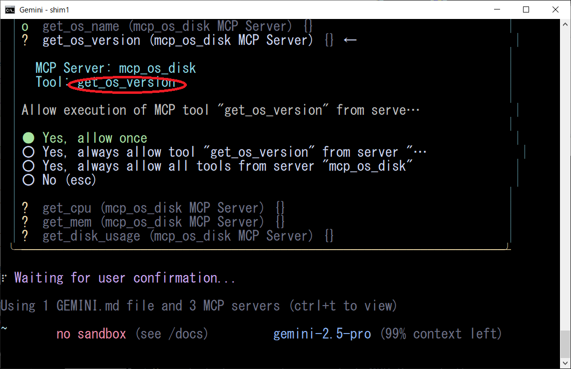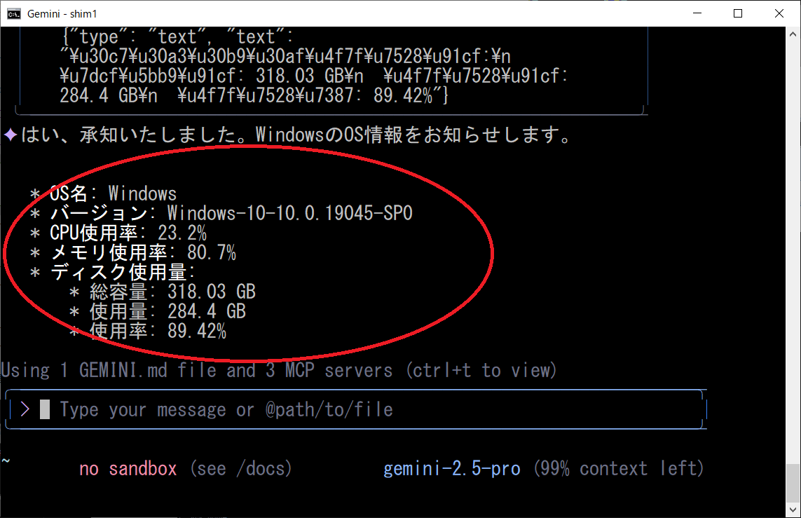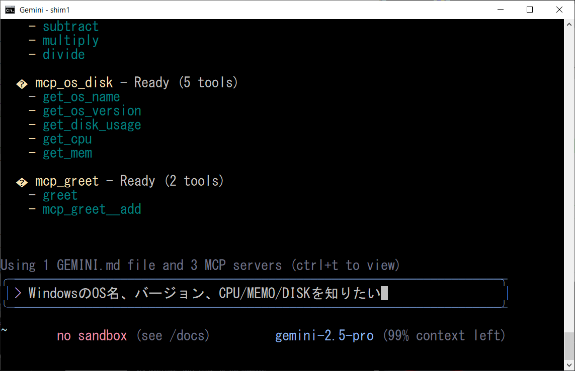WindowsのOS名、バージョン、CPU/MEM/DISKを知りたいGeminiCLIは、上記のプロンプトから「mcp_os_disk」MCPサーバーを特定して、各ツールを順次実行します、凄いですね!!!