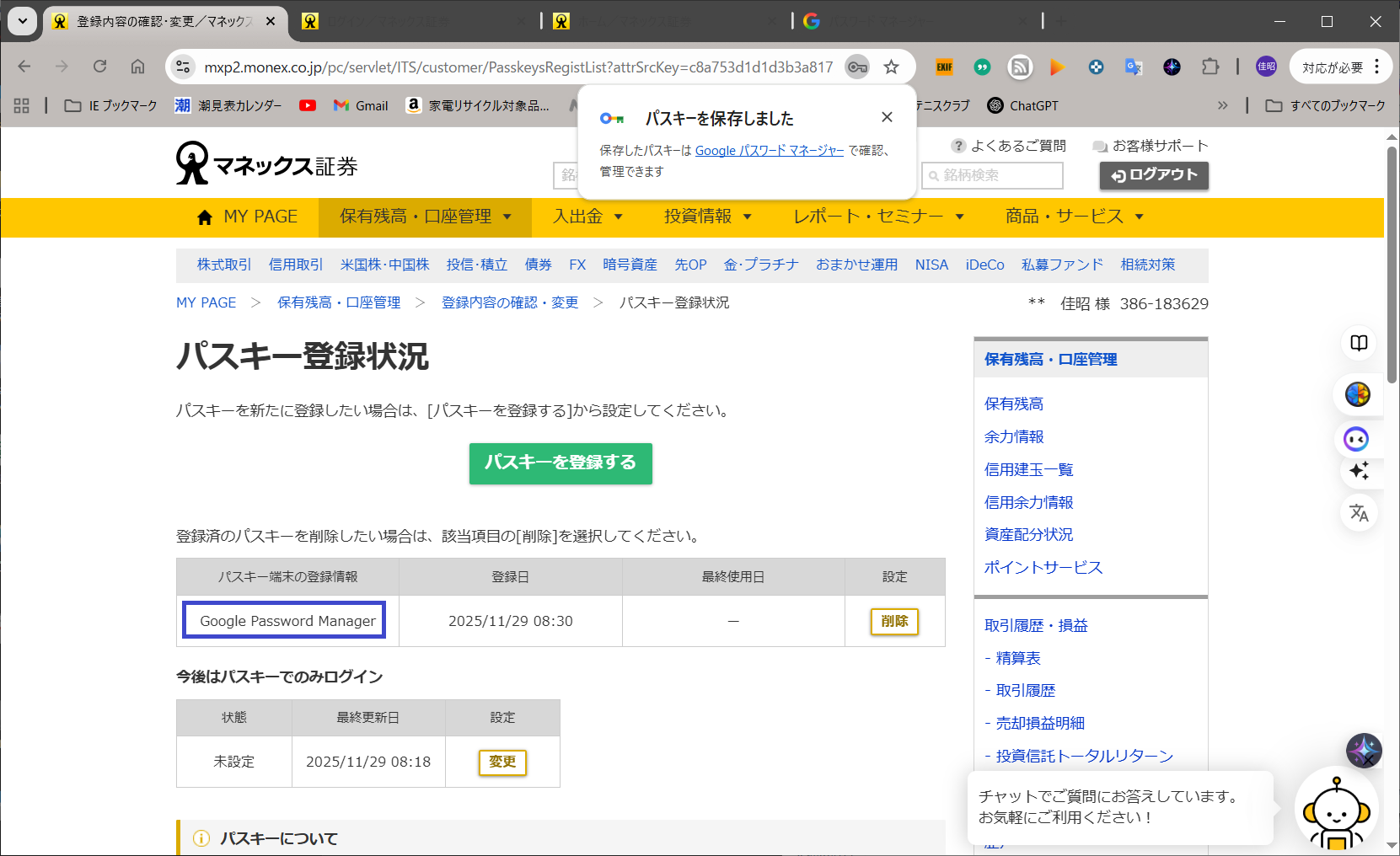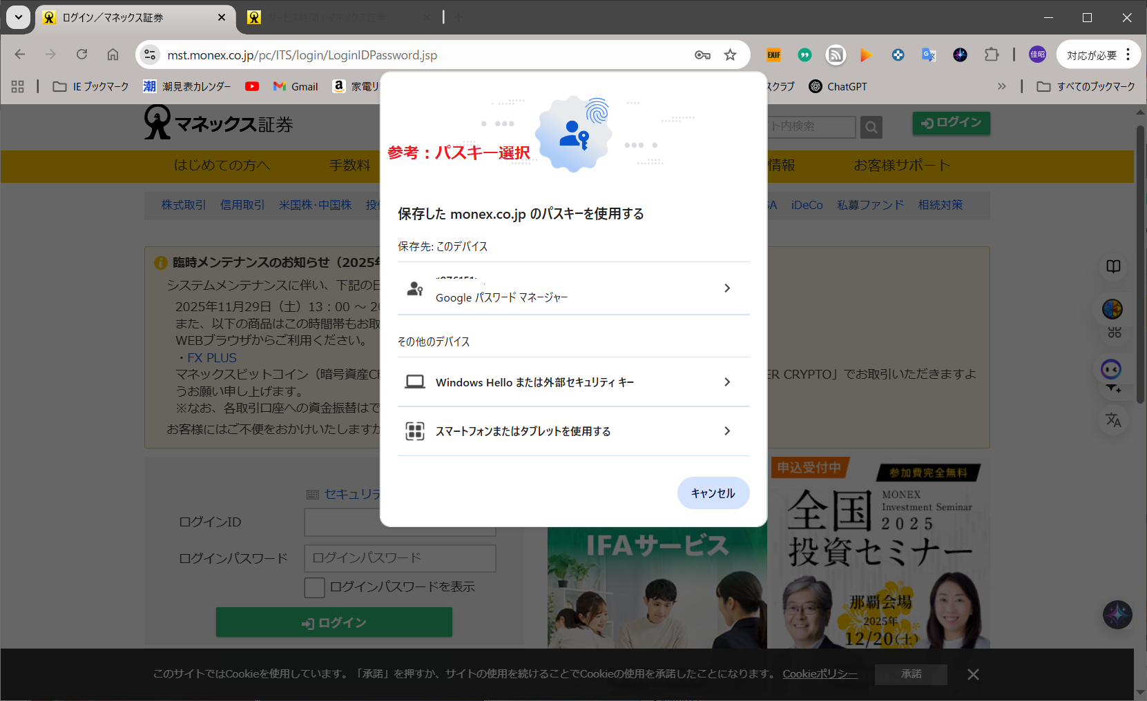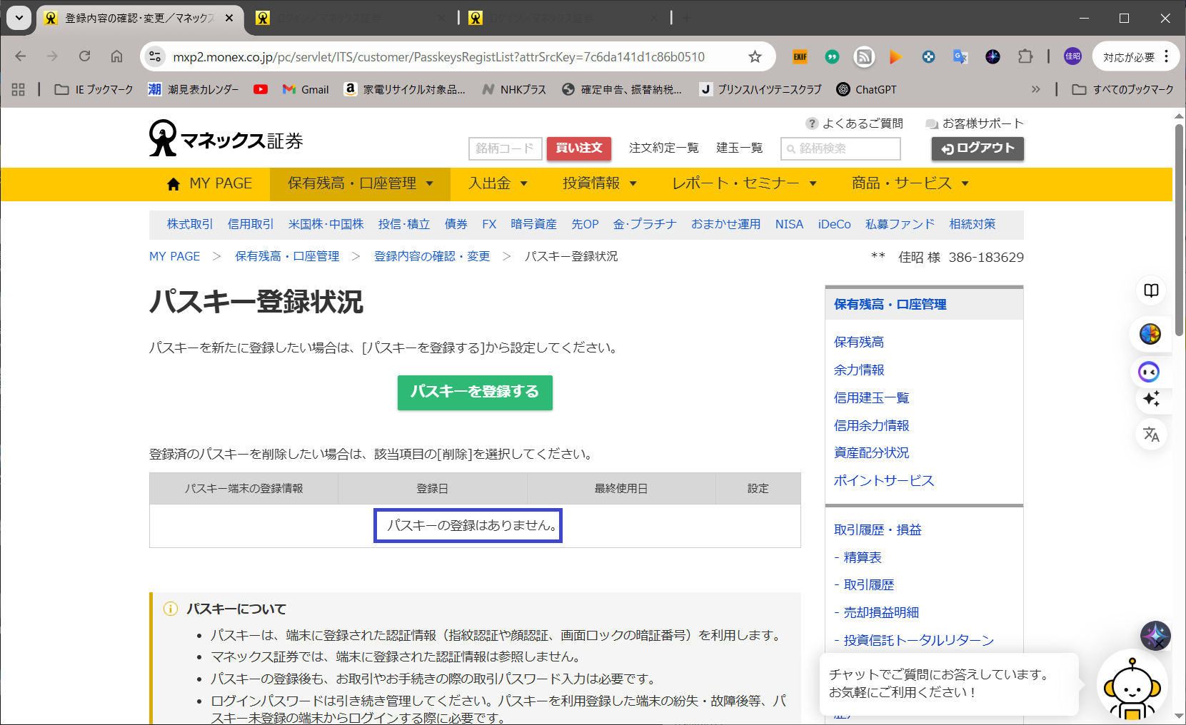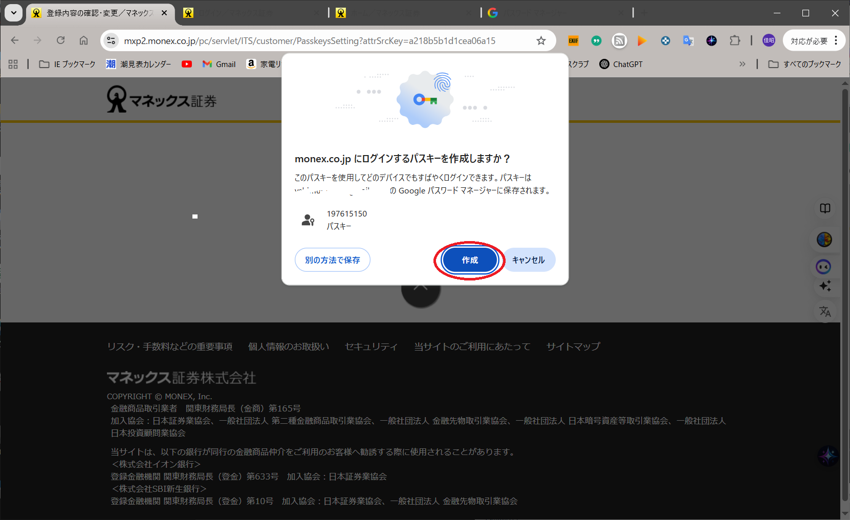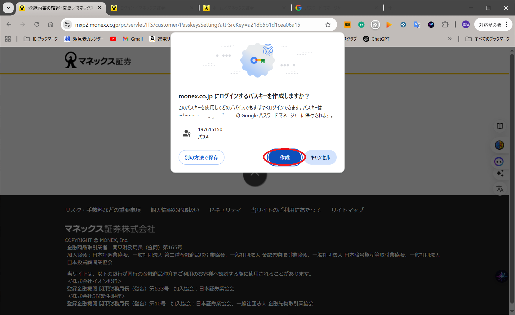 マネックス証券は、2025年12月中旬に「マネックス証券アプリ」へのパスキー対応を予定しています。 なお、2025年10月31日より、ウェブブラウザ(PC・スマホ)や、2025年12月頃までにはアプリもパスキー認証を順次導入予定です。 ・ウェブブラウザ(PC・スマホ): 2025年10月31日より対応済みです。 ・マネックス証券アプリ: 2025年12月中旬の対応を予定しています。○パスキーの登録(PC)