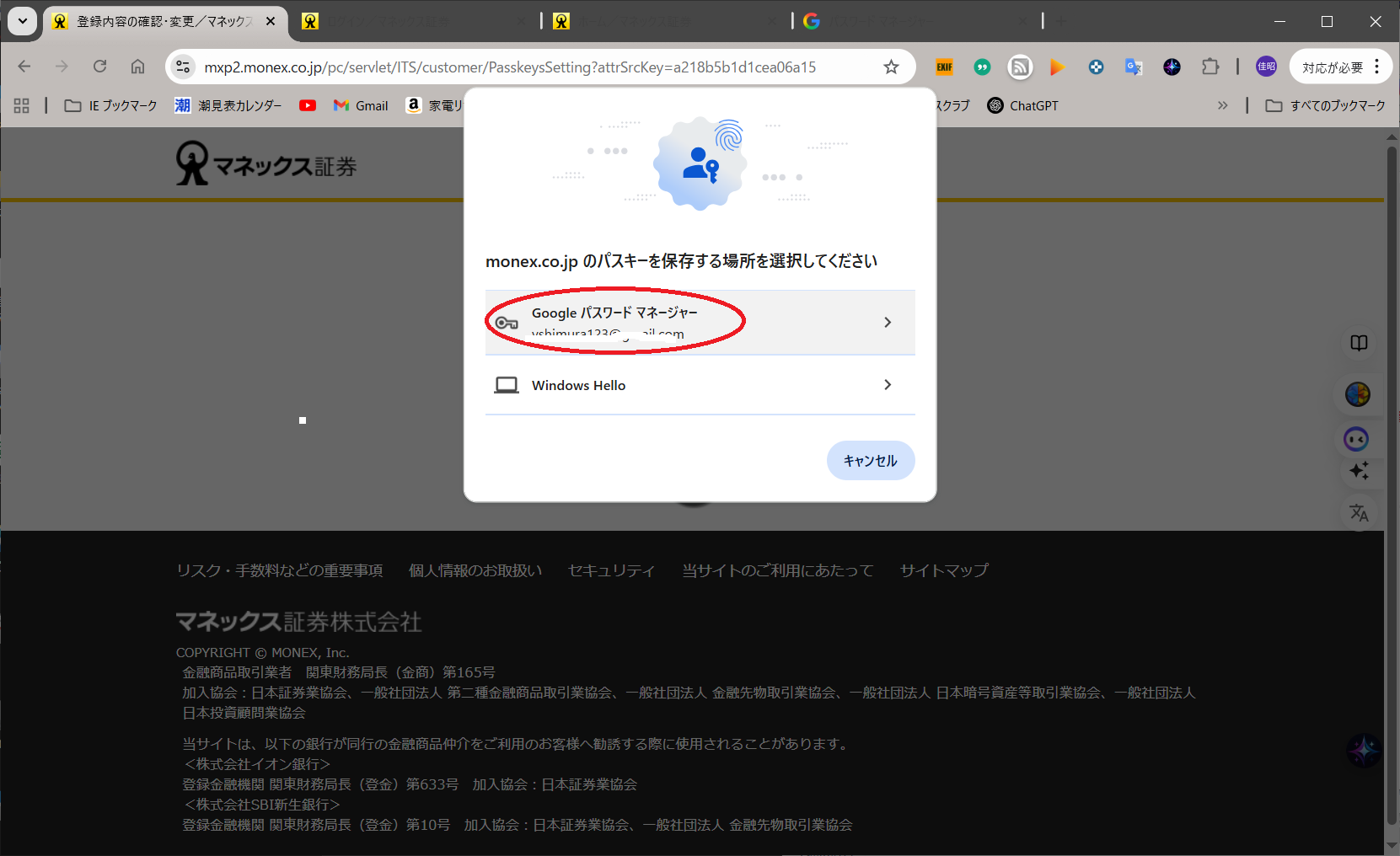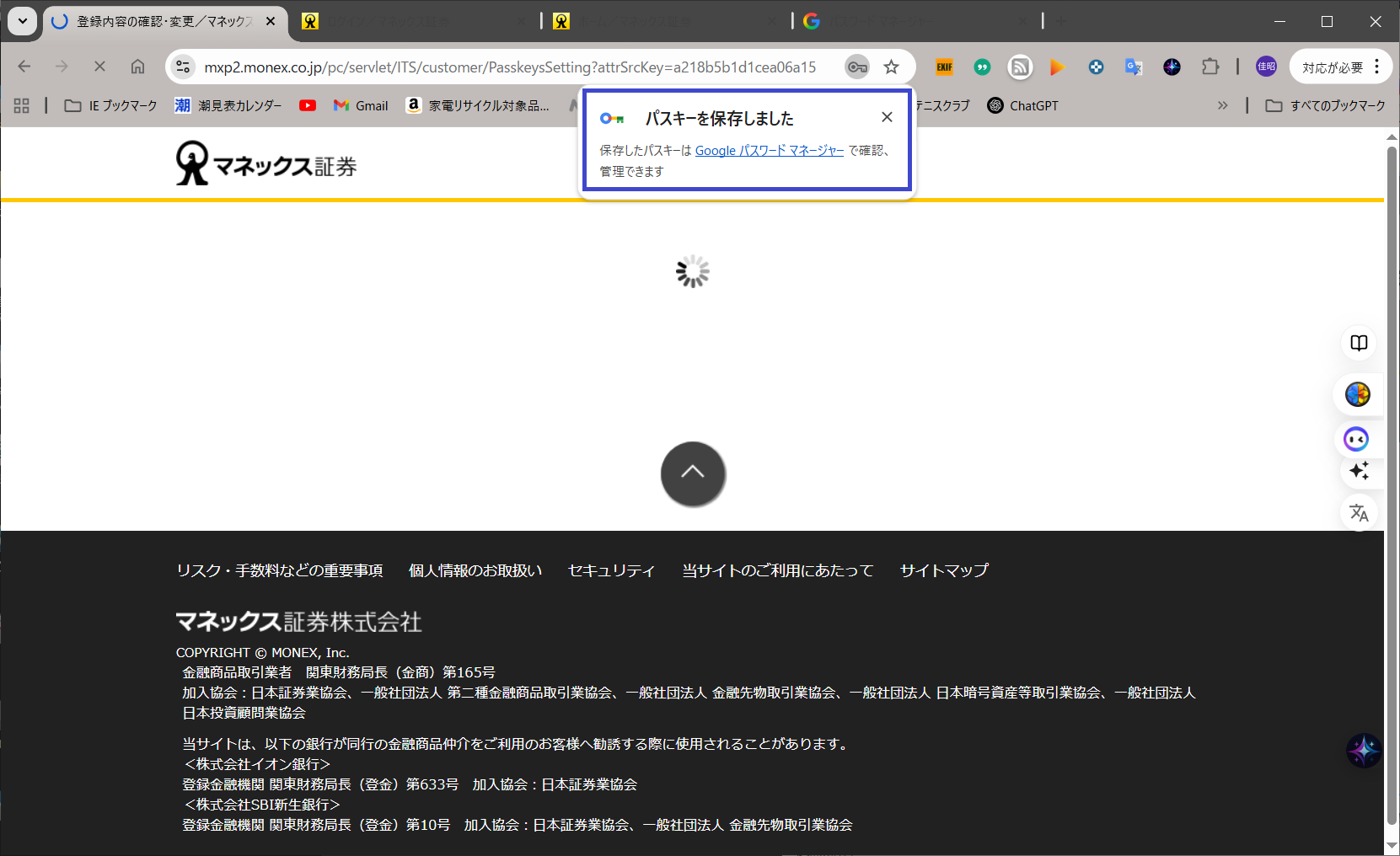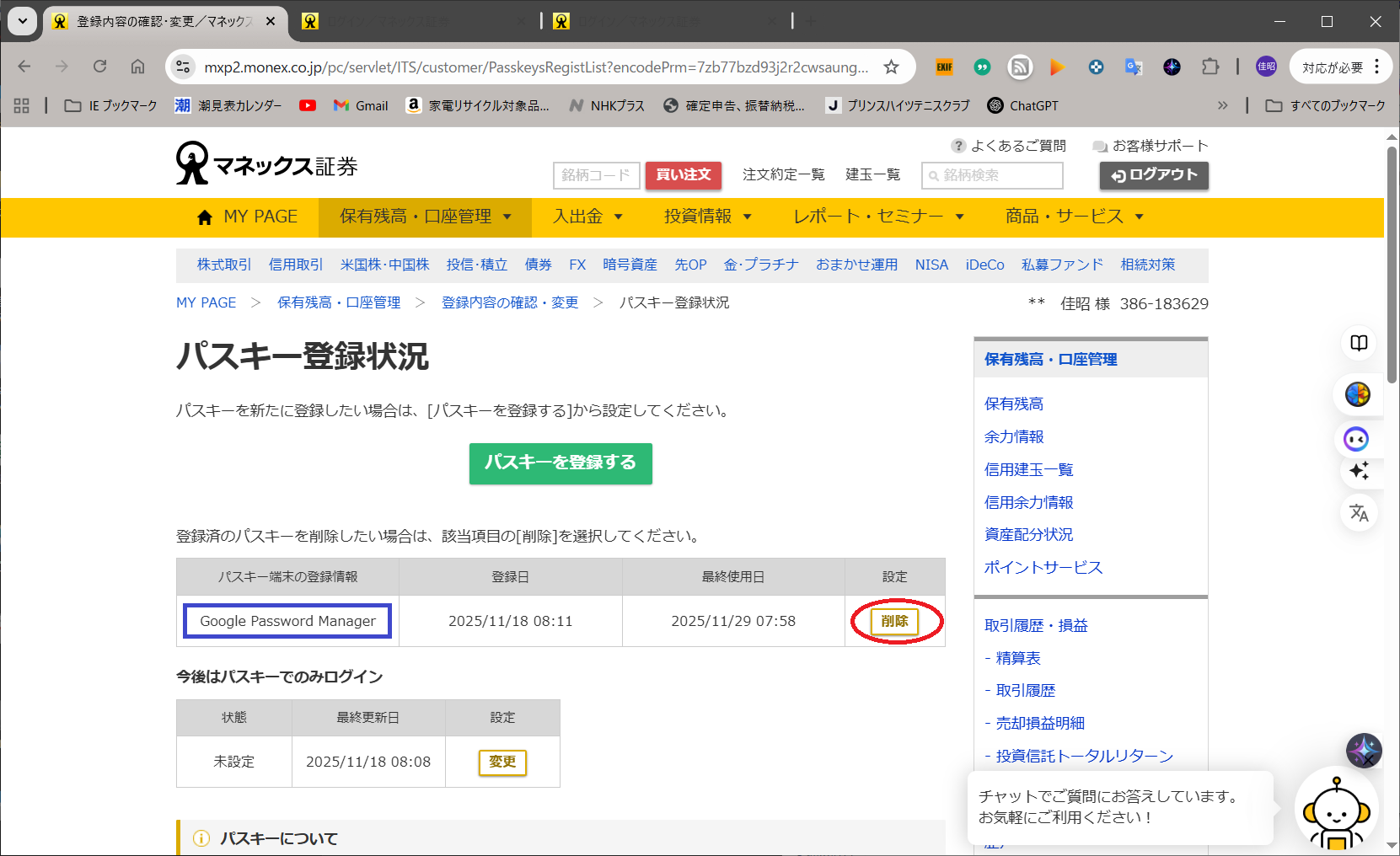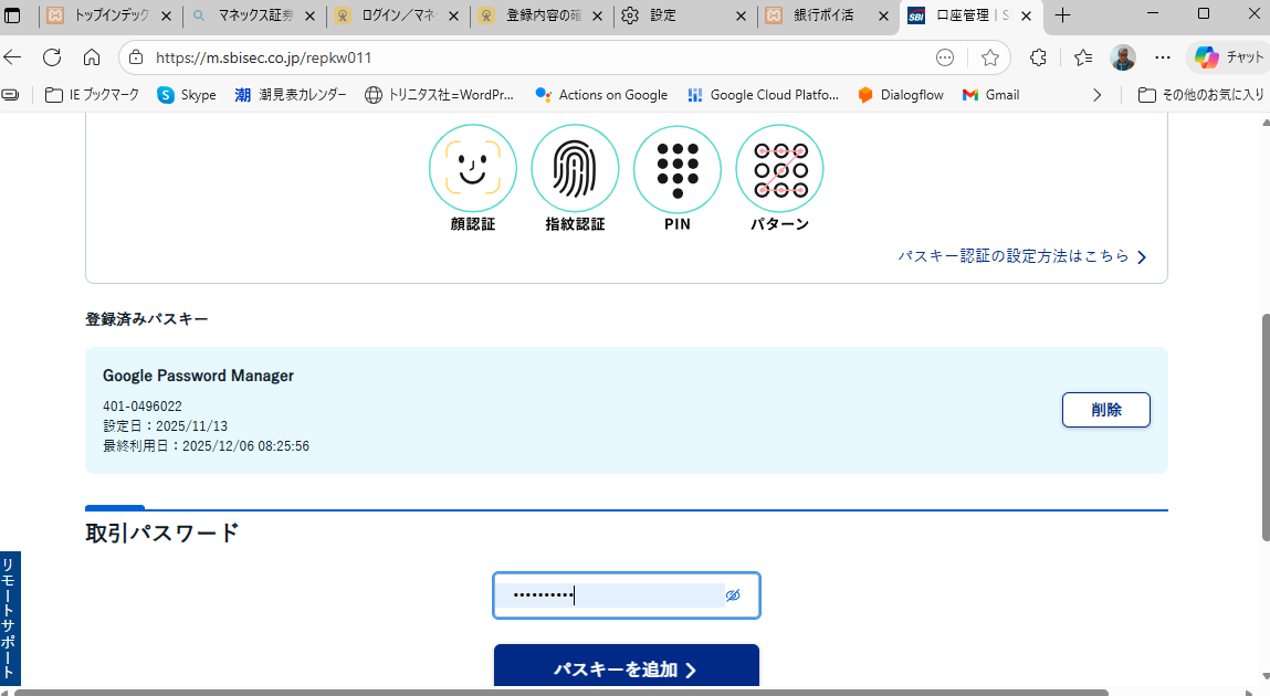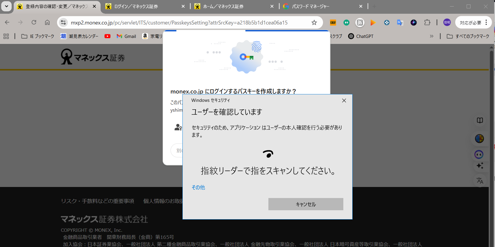 マネックス証券は、2025年12月中旬に「マネックス証券アプリ」へのパスキー対応を予定しています。 なお、2025年10月31日より、ウェブブラウザ(PC・スマホ)や、2025年12月頃までにはアプリもパスキー認証を順次導入予定です。 ・ウェブブラウザ(PC・スマホ): 2025年10月31日より対応済みです。 ・マネックス証券アプリ: 2025年12月中旬の対応を予定しています。○パスキーの登録(PC)