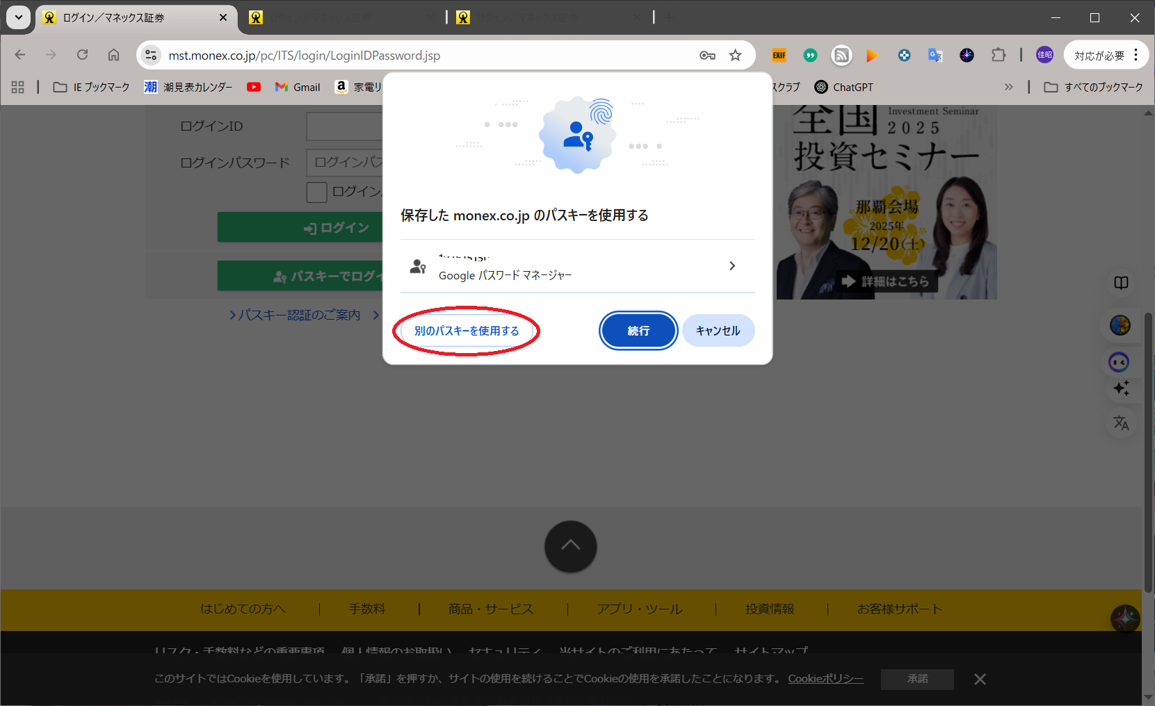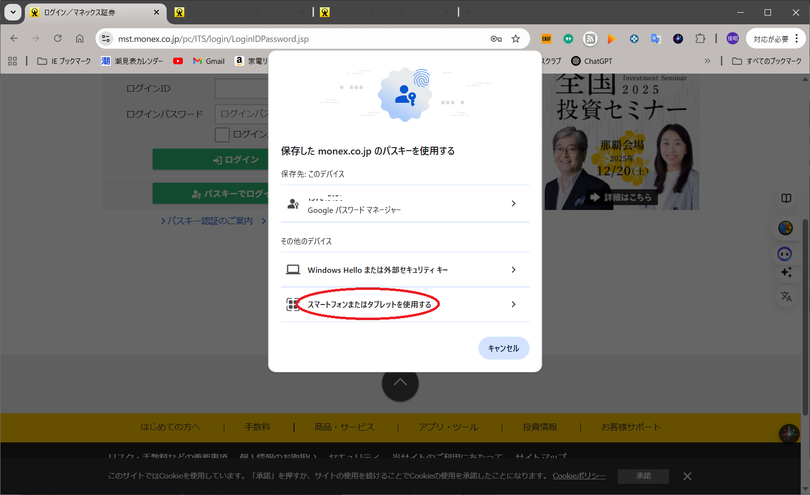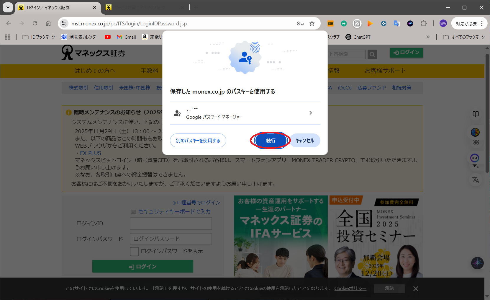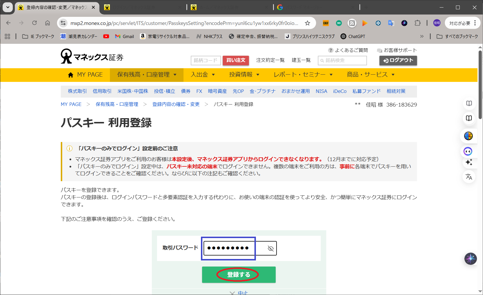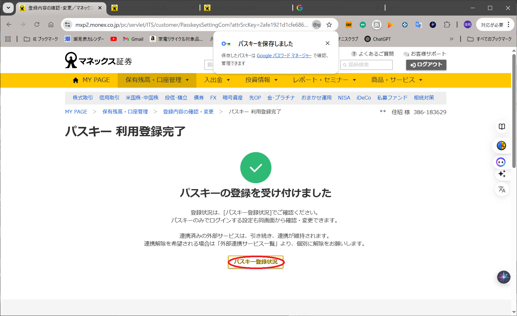 マネックス証券は、2025年12月中旬に「マネックス証券アプリ」へのパスキー対応を予定しています。 なお、2025年10月31日より、ウェブブラウザ(PC・スマホ)や、2025年12月頃までにはアプリもパスキー認証を順次導入予定です。 ・ウェブブラウザ(PC・スマホ): 2025年10月31日より対応済みです。 ・マネックス証券アプリ: 2025年12月中旬の対応を予定しています。○パスキーの登録(PC)