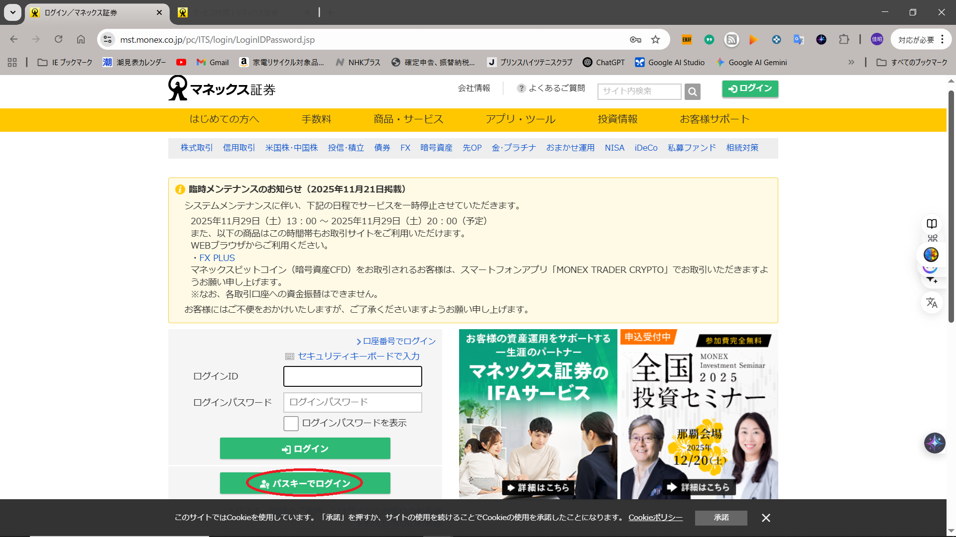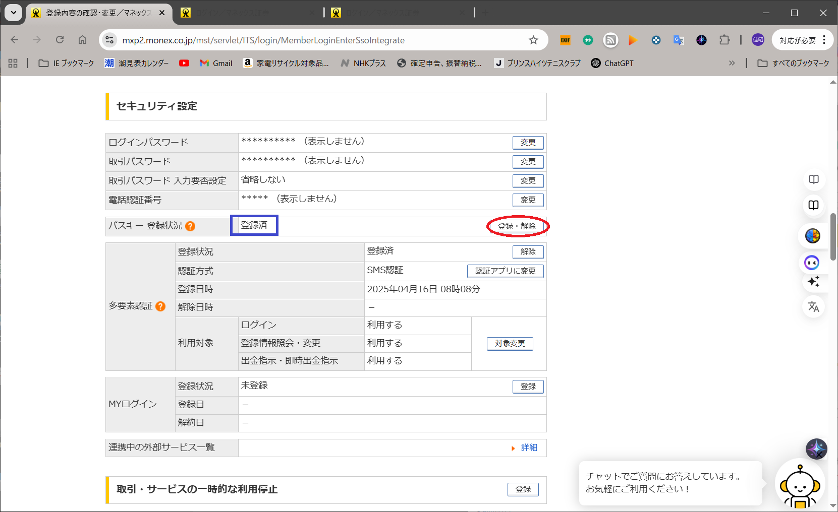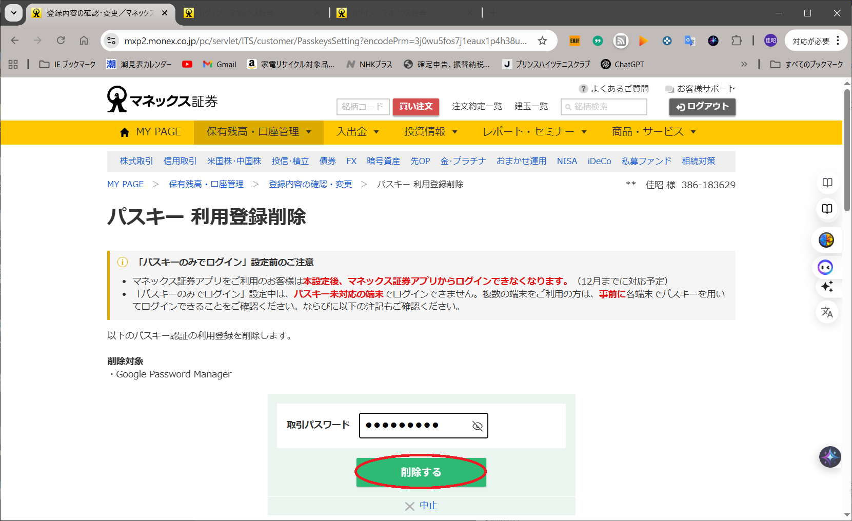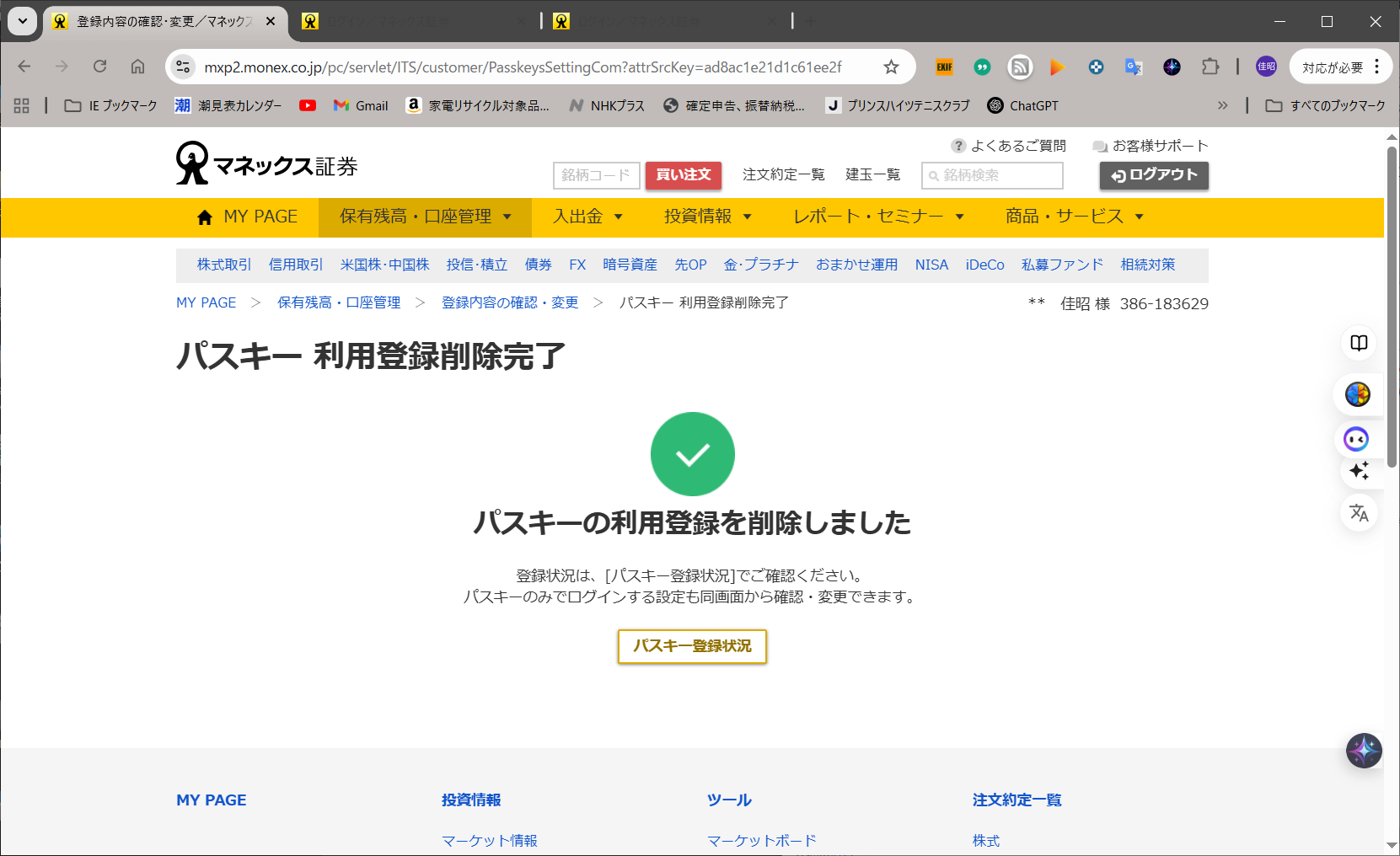 マネックス証券は、2025年12月中旬に「マネックス証券アプリ」へのパスキー対応を予定しています。 なお、2025年10月31日より、ウェブブラウザ(PC・スマホ)や、2025年12月頃までにはアプリもパスキー認証を順次導入予定です。 ・ウェブブラウザ(PC・スマホ): 2025年10月31日より対応済みです。 ・マネックス証券アプリ: 2025年12月中旬の対応を予定しています。○パスキーの登録(PC)