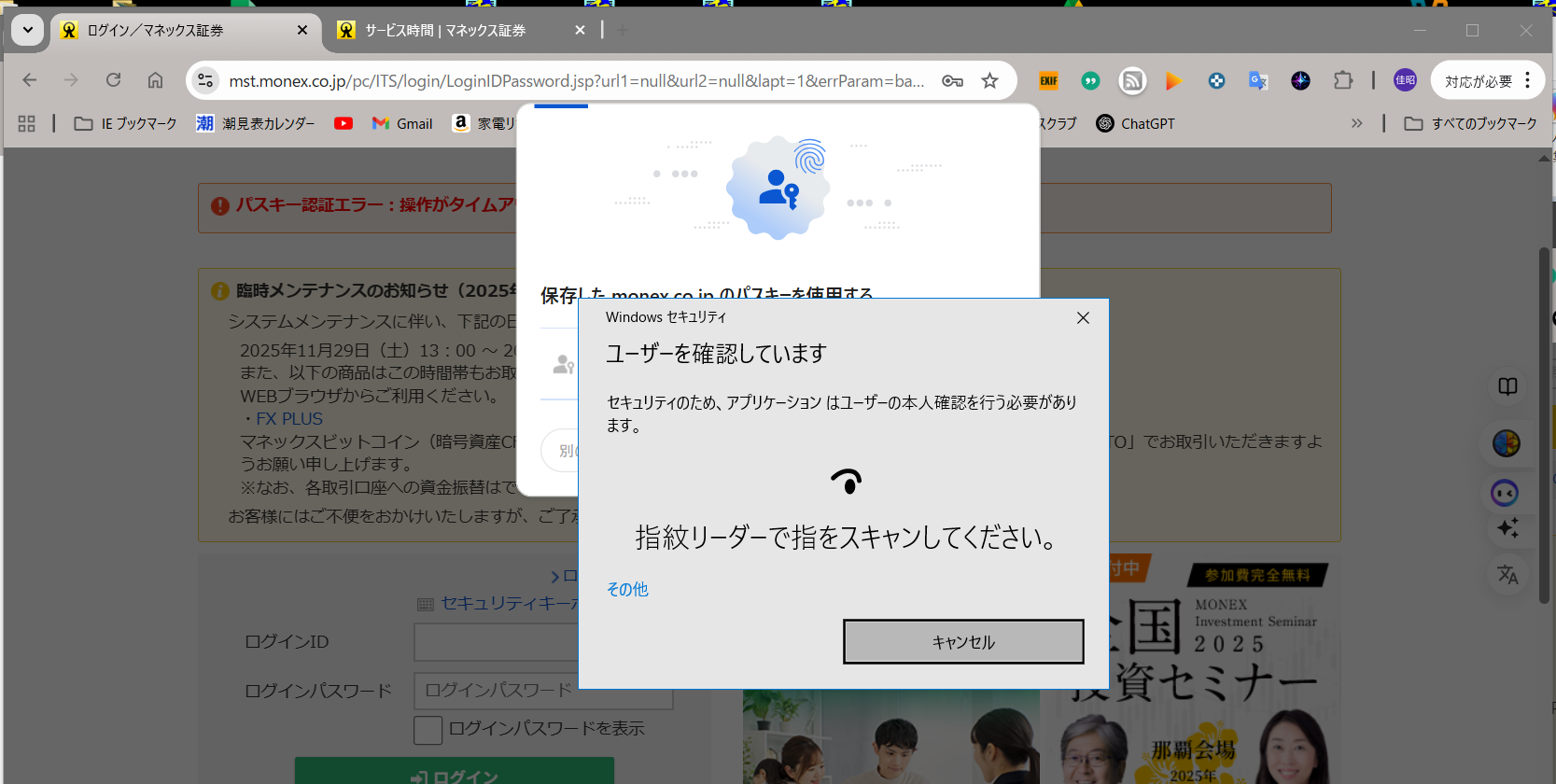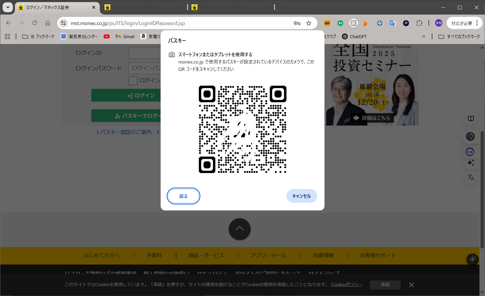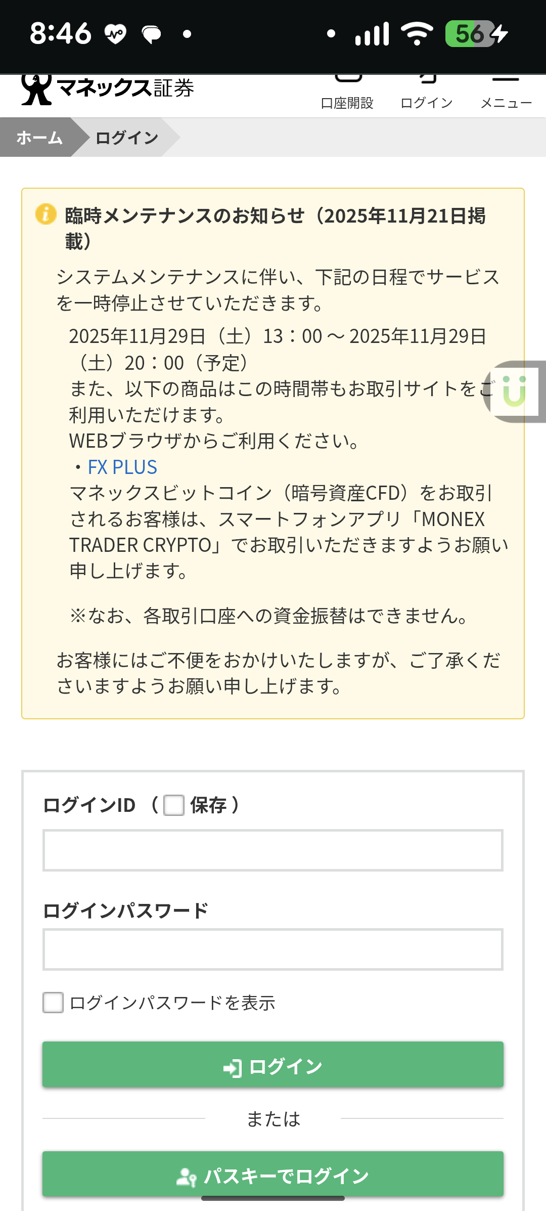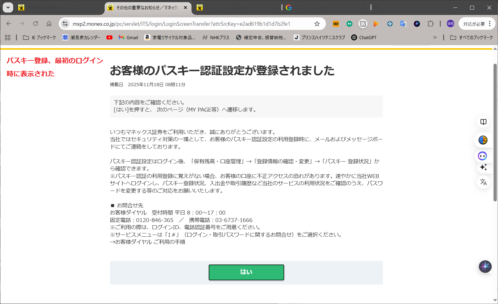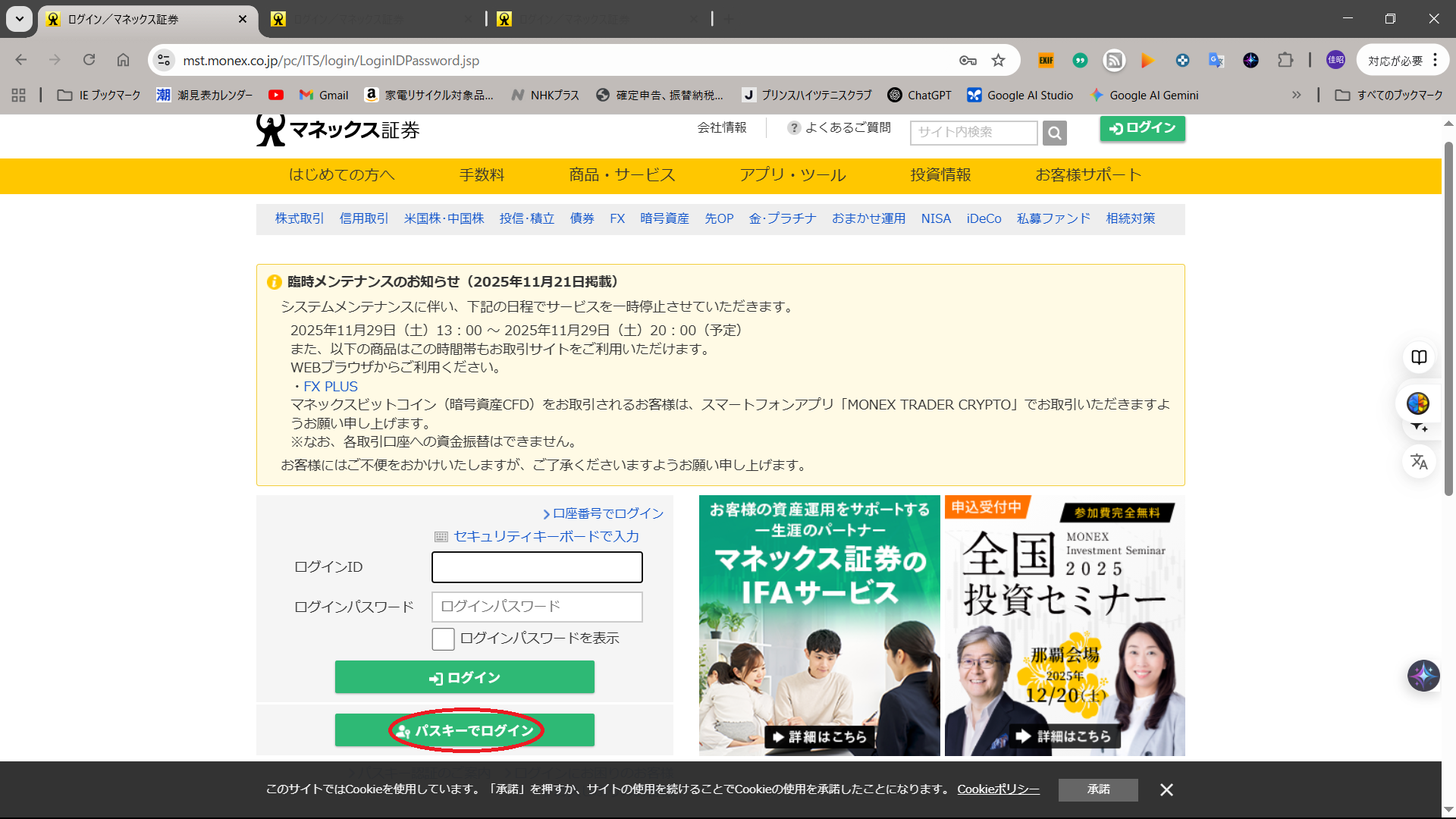 マネックス証券は、2025年12月中旬に「マネックス証券アプリ」へのパスキー対応を予定しています。 なお、2025年10月31日より、ウェブブラウザ(PC・スマホ)や、2025年12月頃までにはアプリもパスキー認証を順次導入予定です。 ・ウェブブラウザ(PC・スマホ): 2025年10月31日より対応済みです。 ・マネックス証券アプリ: 2025年12月中旬の対応を予定しています。○パスキーの登録(PC)