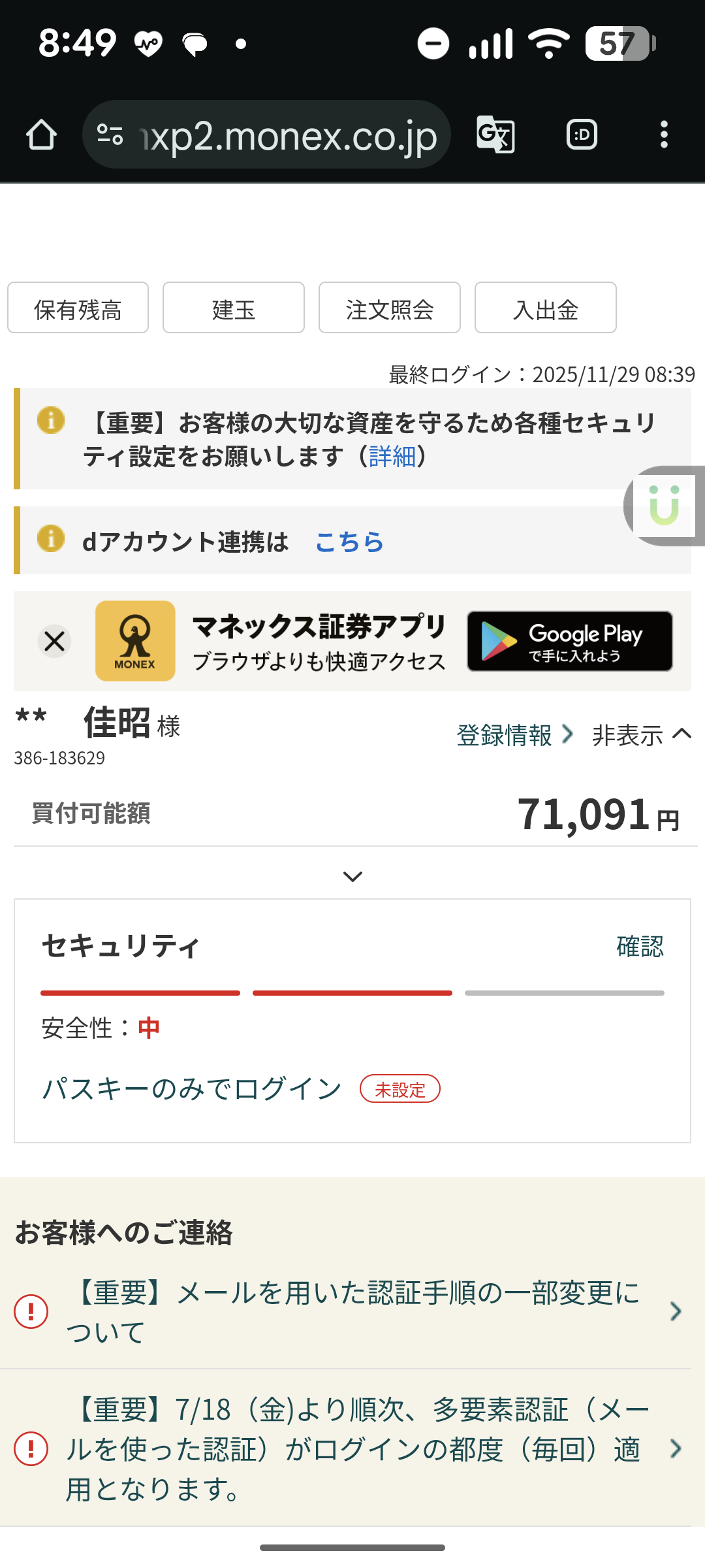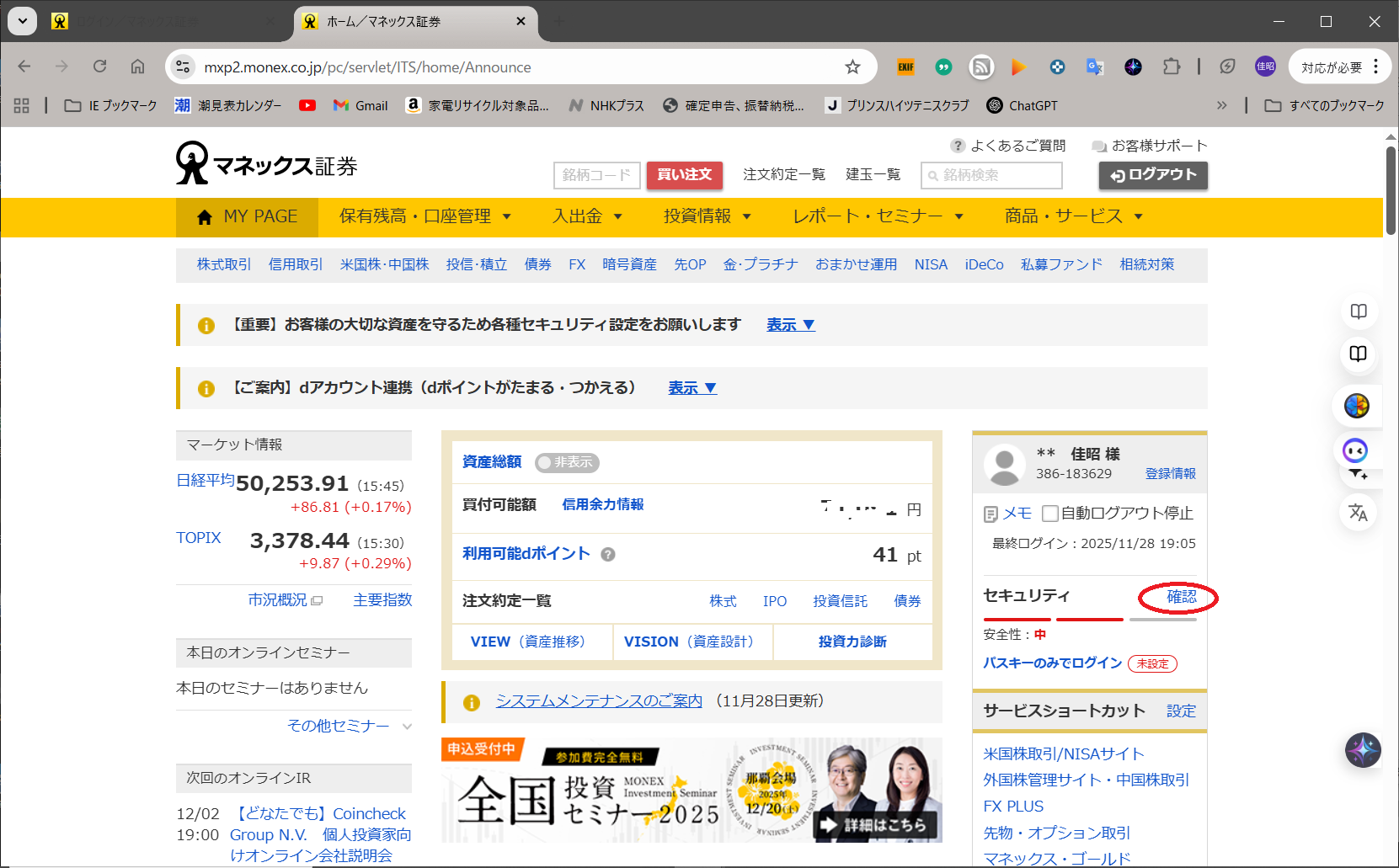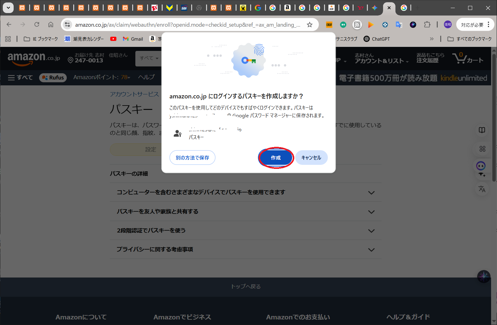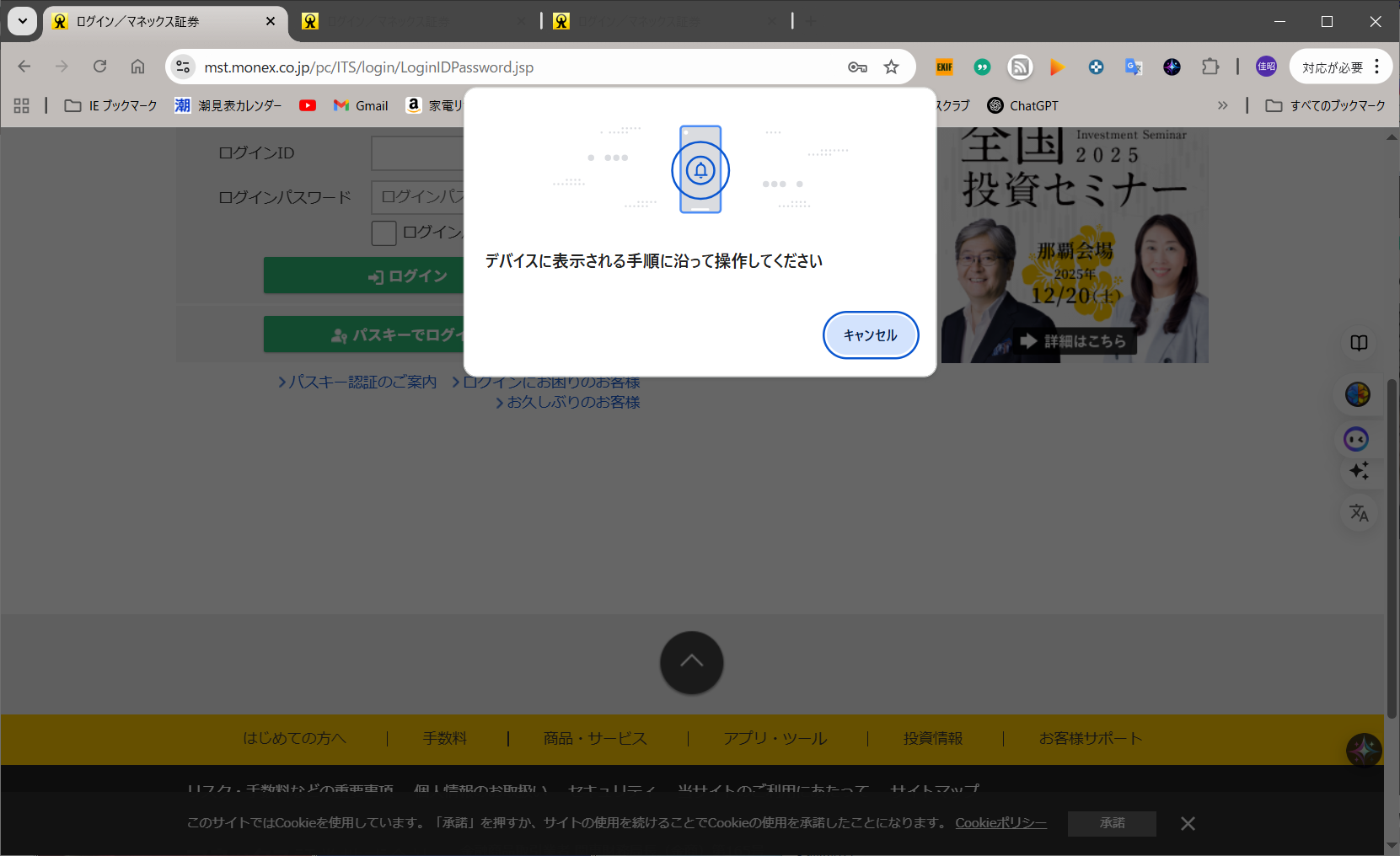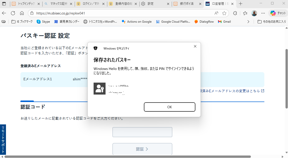 マネックス証券は、2025年12月中旬に「マネックス証券アプリ」へのパスキー対応を予定しています。 なお、2025年10月31日より、ウェブブラウザ(PC・スマホ)や、2025年12月頃までにはアプリもパスキー認証を順次導入予定です。 ・ウェブブラウザ(PC・スマホ): 2025年10月31日より対応済みです。 ・マネックス証券アプリ: 2025年12月中旬の対応を予定しています。○パスキーの登録(PC)