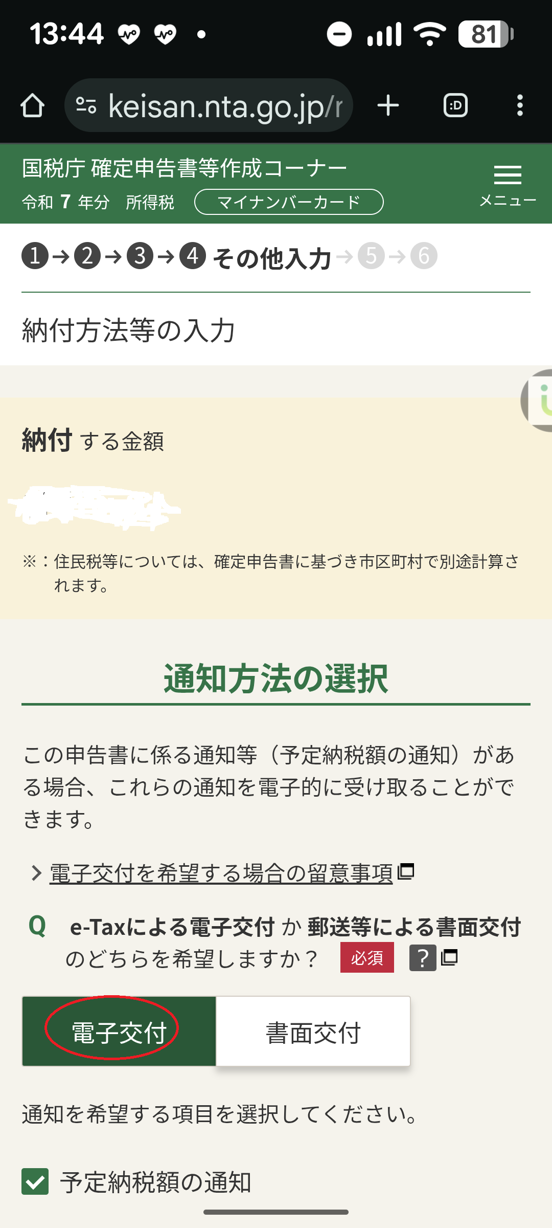 ・納税額の確認、納税方法(今回は電子納付を選択)を指定します。