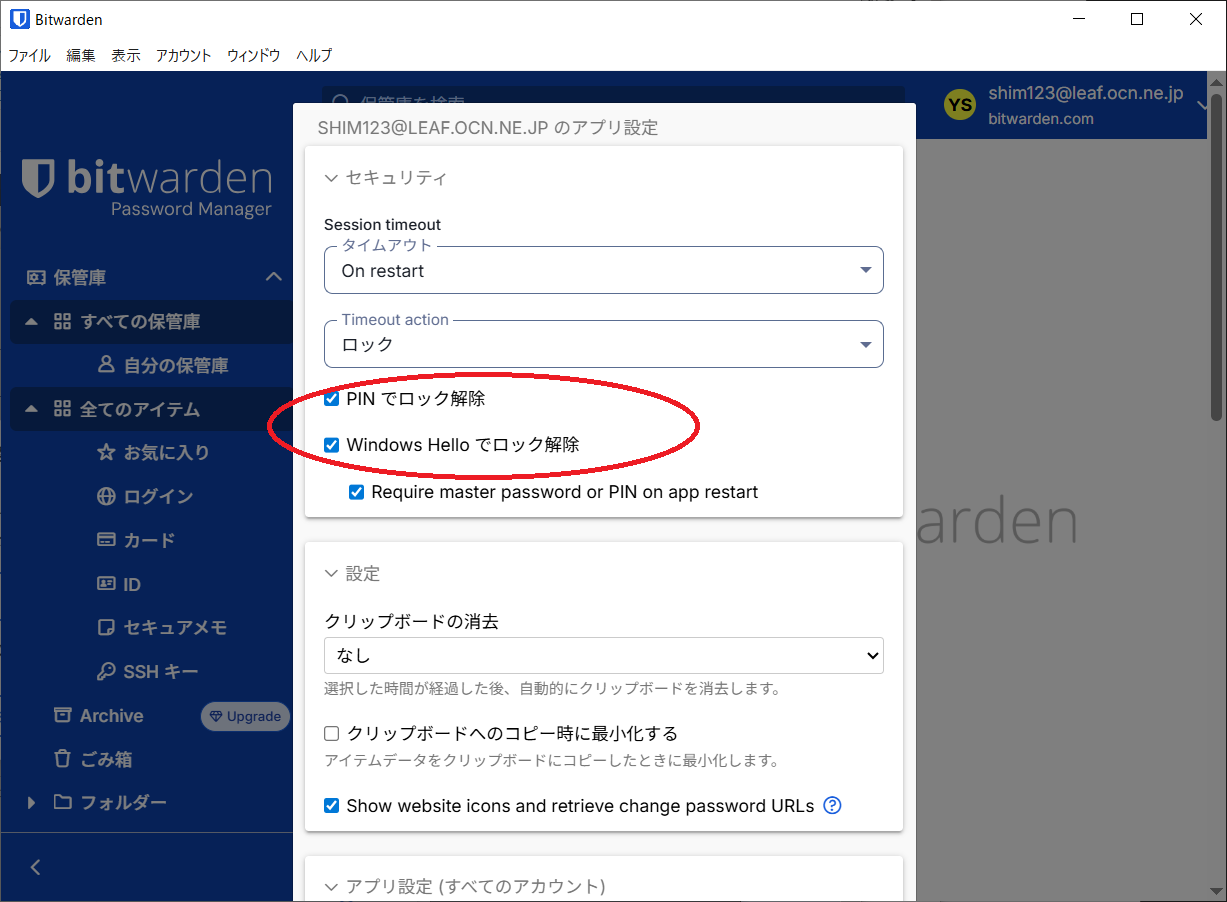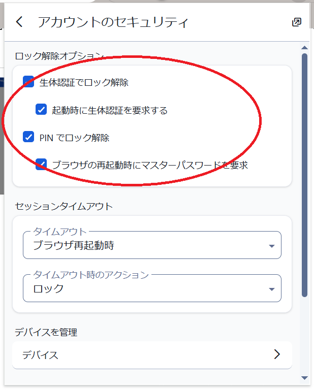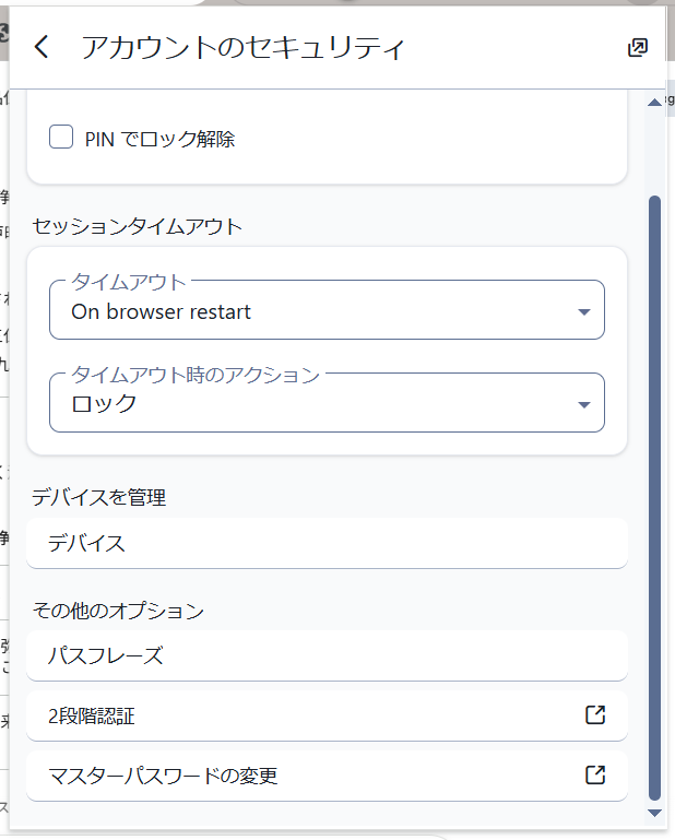 以下の設定を行うことで、普段の操作からマスターパスワードの入力を排除できます。 1. 「パスキーでログイン」を有効にする Web版の「設定」→「アカウント」→「セキュリティ」から登録します。 2. 「保管庫の暗号化にパスキーを使用する」にチェックを入れる ・これが重要です。チェックを入れることで、ログイン時の「認証」とデータの「復号(中身を見る)」の両方をパスキー(指紋や顔認証)だけで完結させられます。 3. 再ログインの手間を減らす設定(オプション) ・ブラウザ拡張機能やスマホアプリの設定で「保管庫のタイムアウト」を調整し、ロック解除に指紋やPIN(Windows Helloなど)を使用するように設定します。