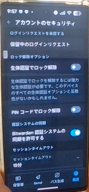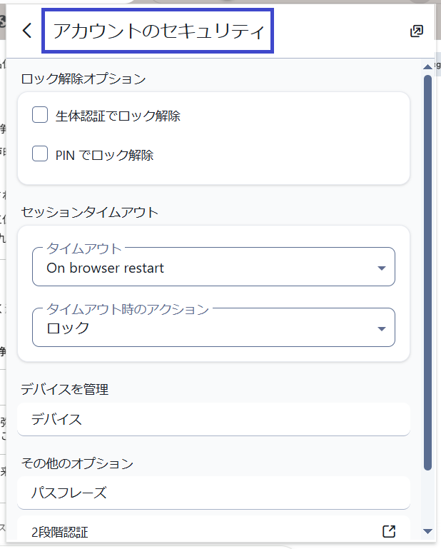 | 生体認証 Unlock with Biometrics | 指紋や顔認証で即座にロック解除。 | あくまで「ロック解除」用であり、アプリの再起動時などにはマスターパスワードが必要な場合がある。 | 頻繁に保管庫を開く人 |